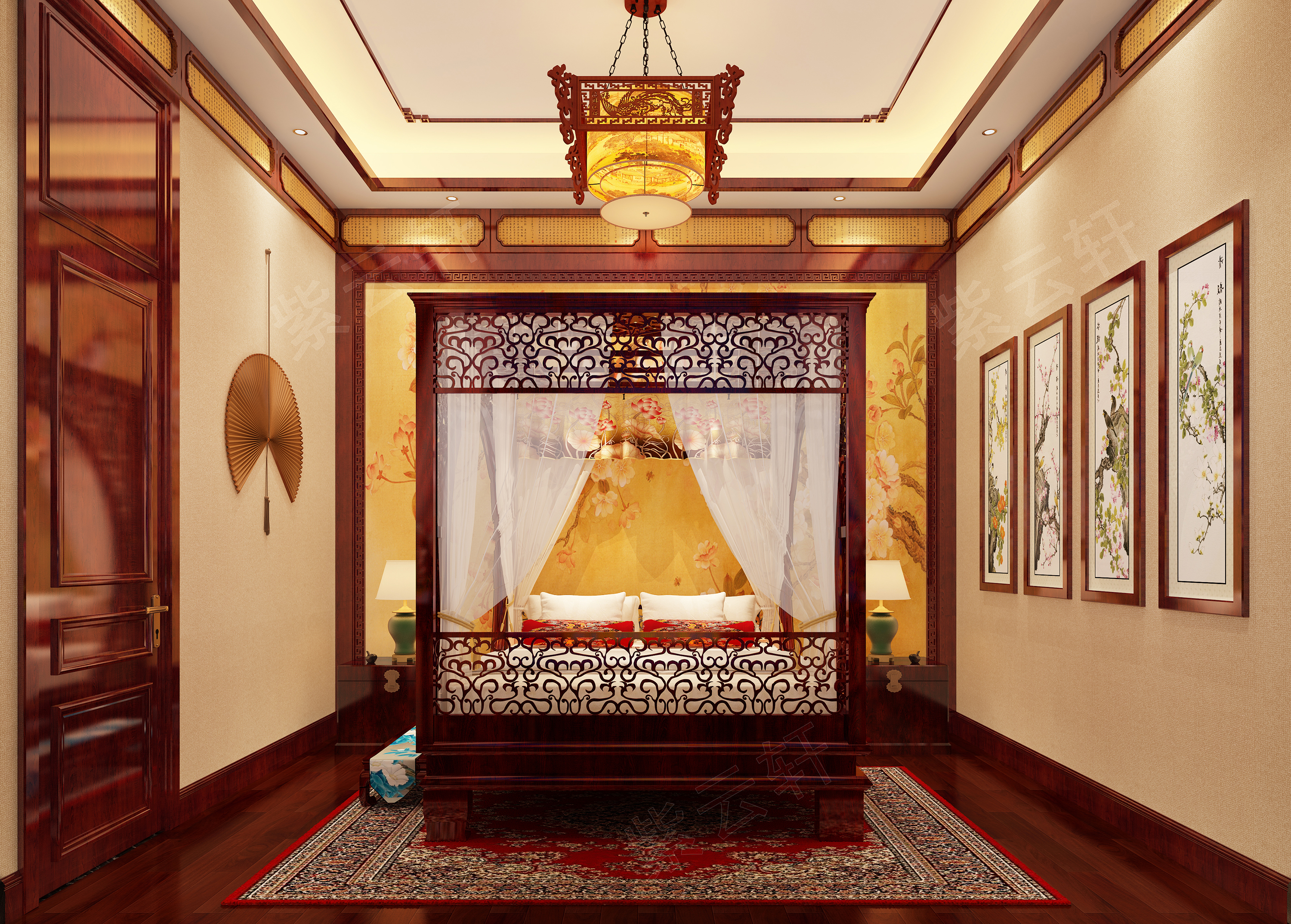二层主卧中式装修设计风格图,主卧别出心裁的设计就是昏黄璀璨的灯光和文雅清淡的壁画,搭配着古色古香的实木地板,温馨治愈,是家的归属感!