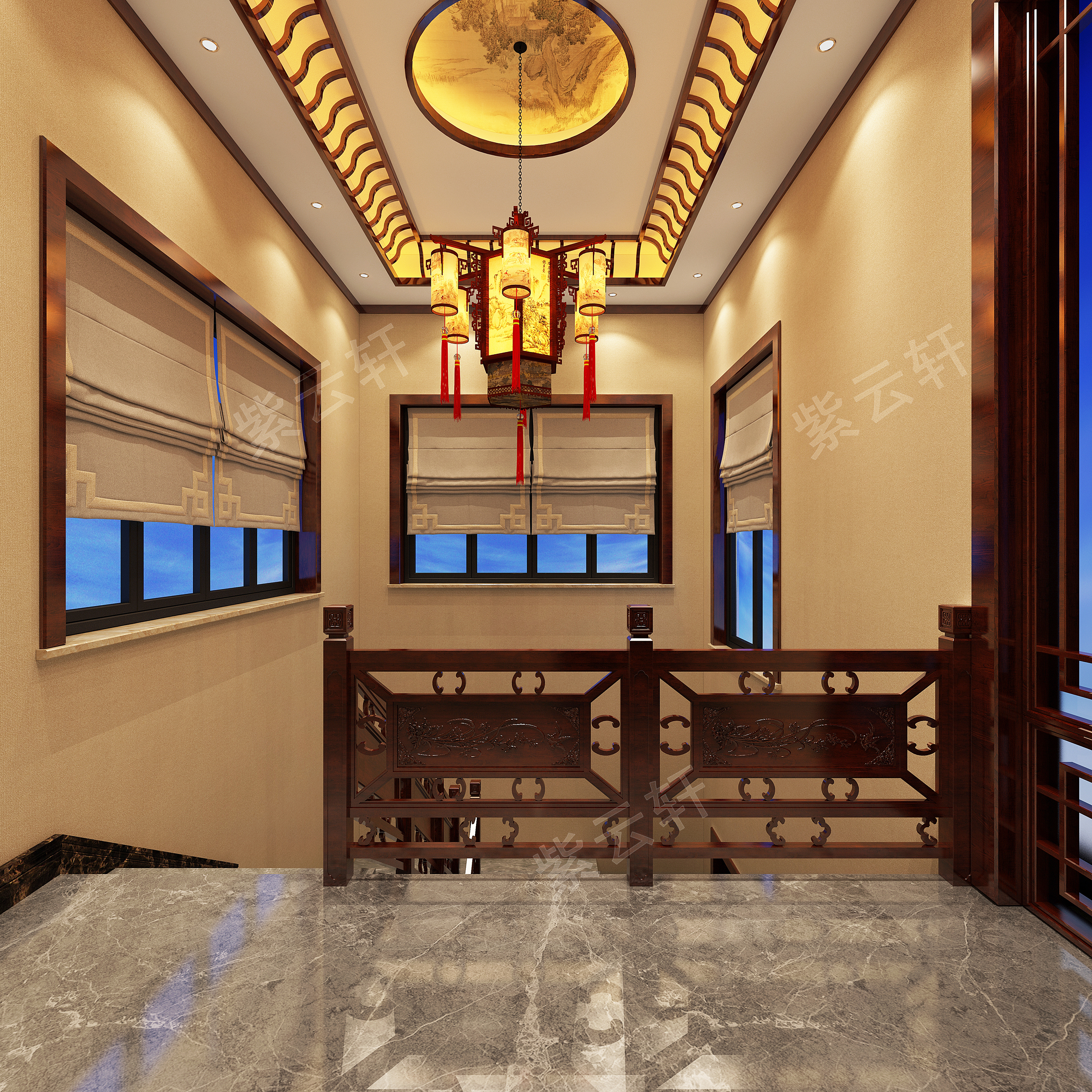 负一楼梯厅中式装修设计风格图,窗明几净,锃亮的地板映衬出天花板上灯饰,凸显出中式装修的特点,中式和传统的混搭,经典别致,如诗如画。