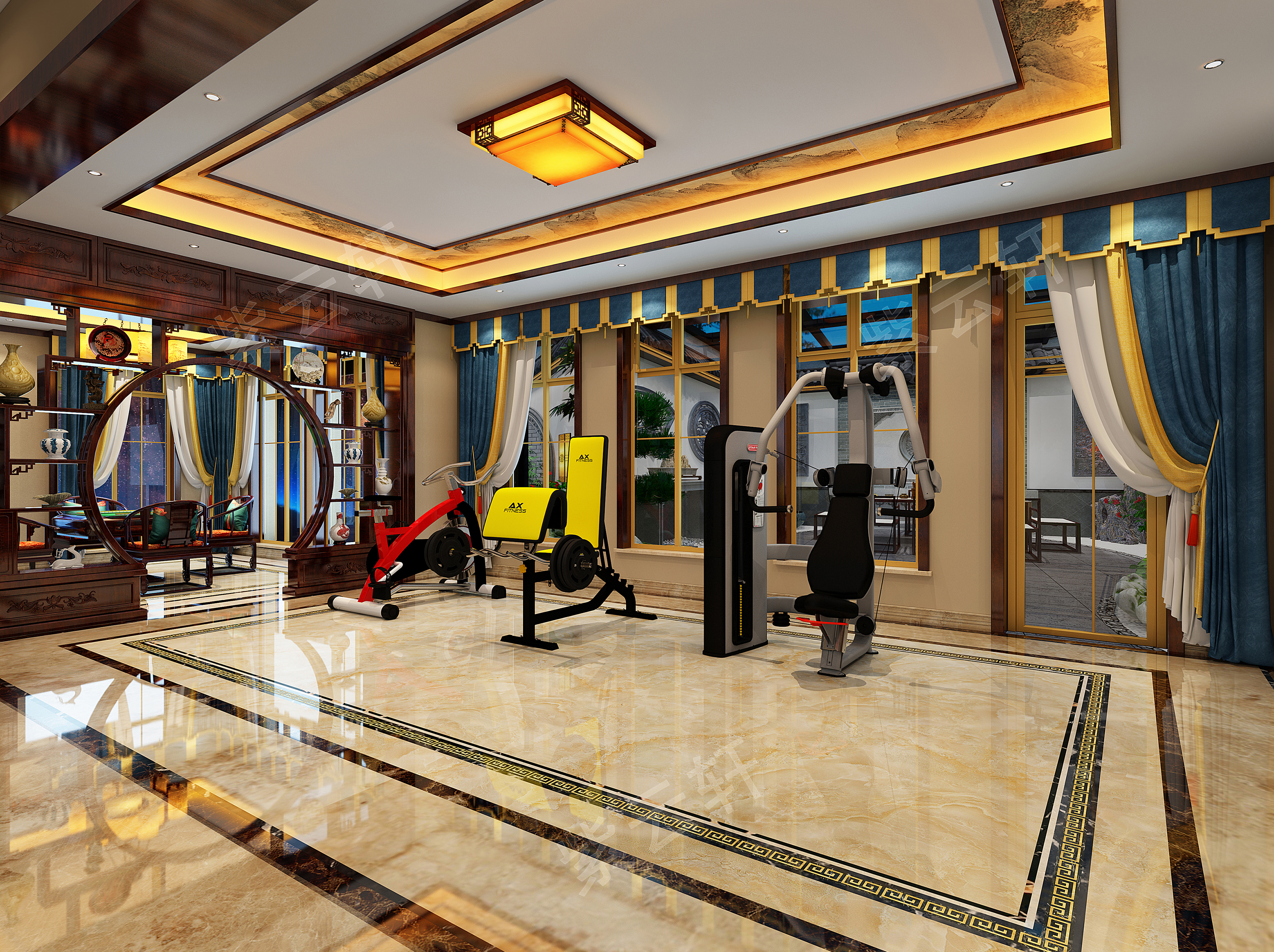负一健身房中式装修设计风格图,宽大敞亮,光可鉴人的地板,精致的木雕屏风错落有致的排列着,挥汗如雨的锻炼完也会瞬间神清气爽!