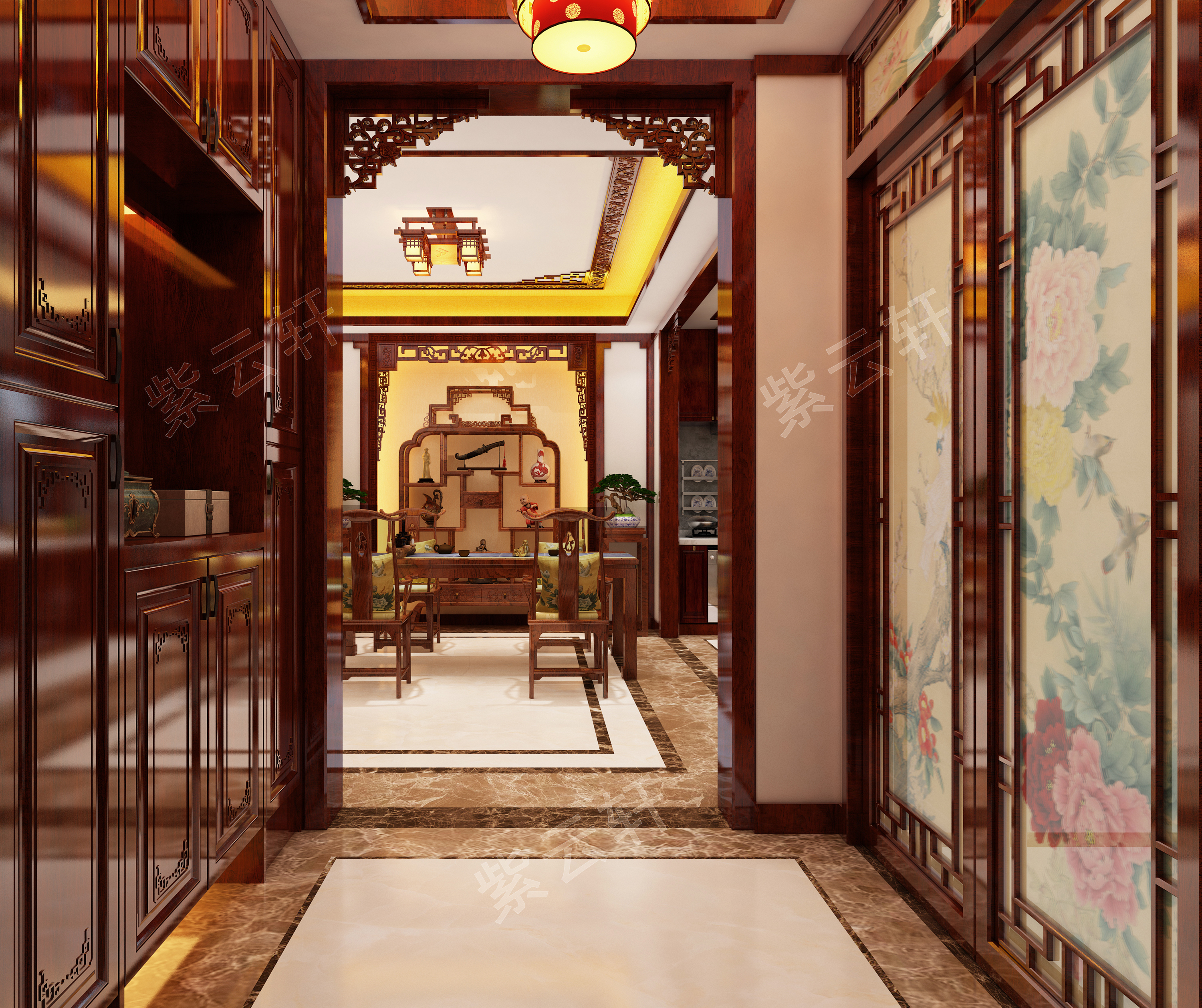 一层玄关中式装修设计风格图,简约悠长,换鞋凳的设计也是细微独到,红黄色的大吊灯,蓝黄相隔的帘子,色彩搭配巧妙至极,令人耳目一新!