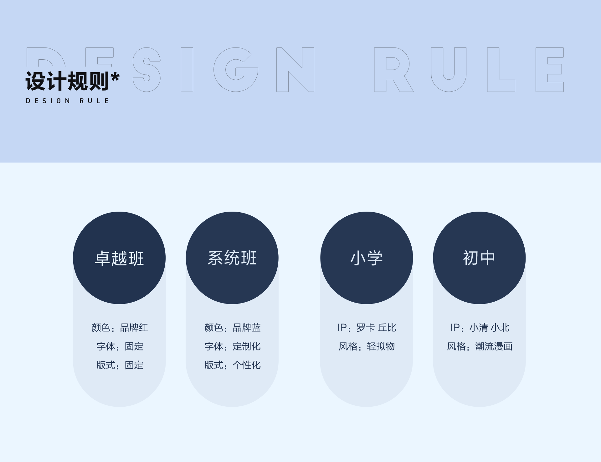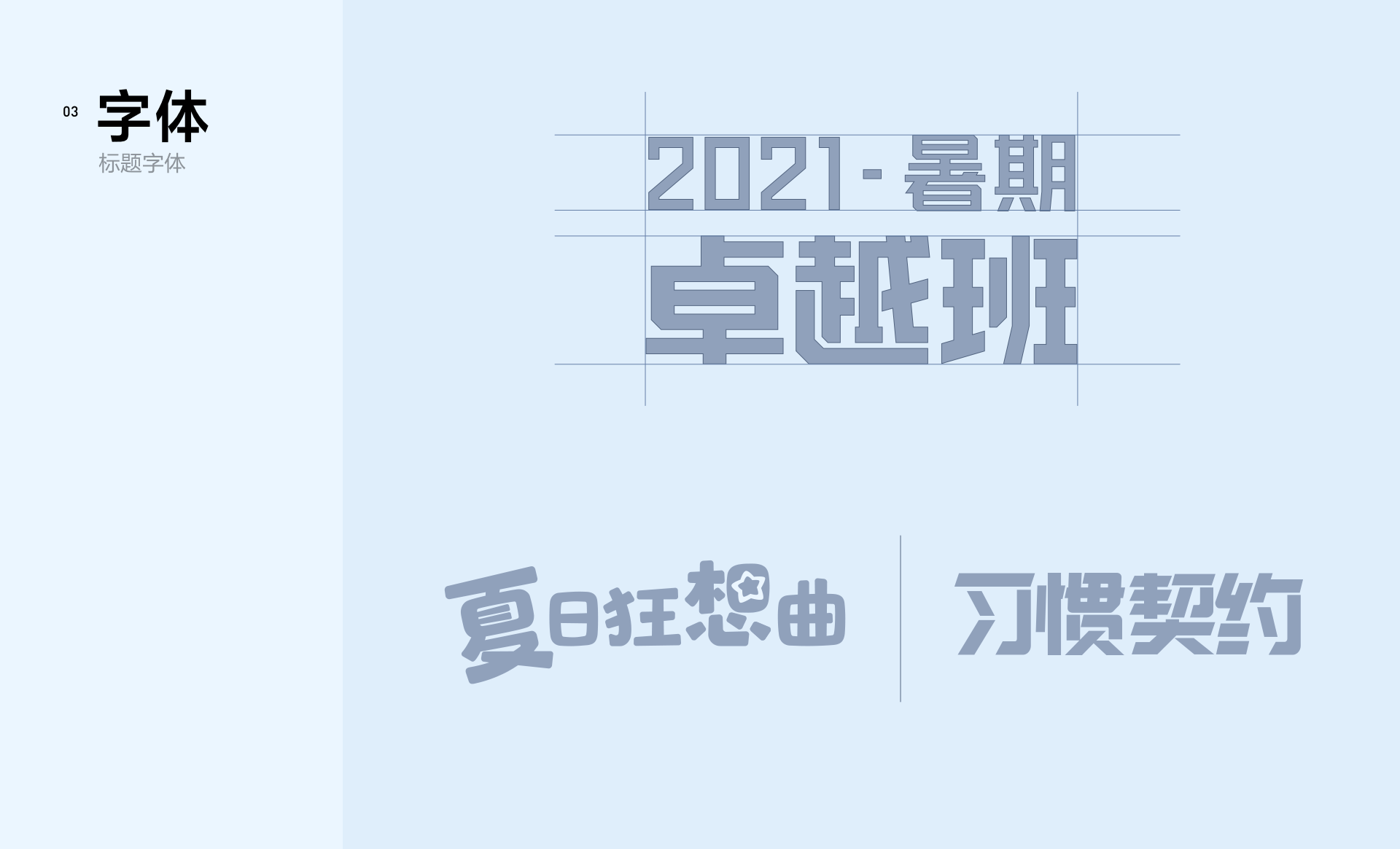 我们规范了卓越班的字体字形,以90度直角衬角的笔画,突出卓越班型的正式感;整体笔画偏粗,突出沉稳专业的视觉感受;同时在个别笔画上做了45度斜角的处理,更能体现卓越的力量感;