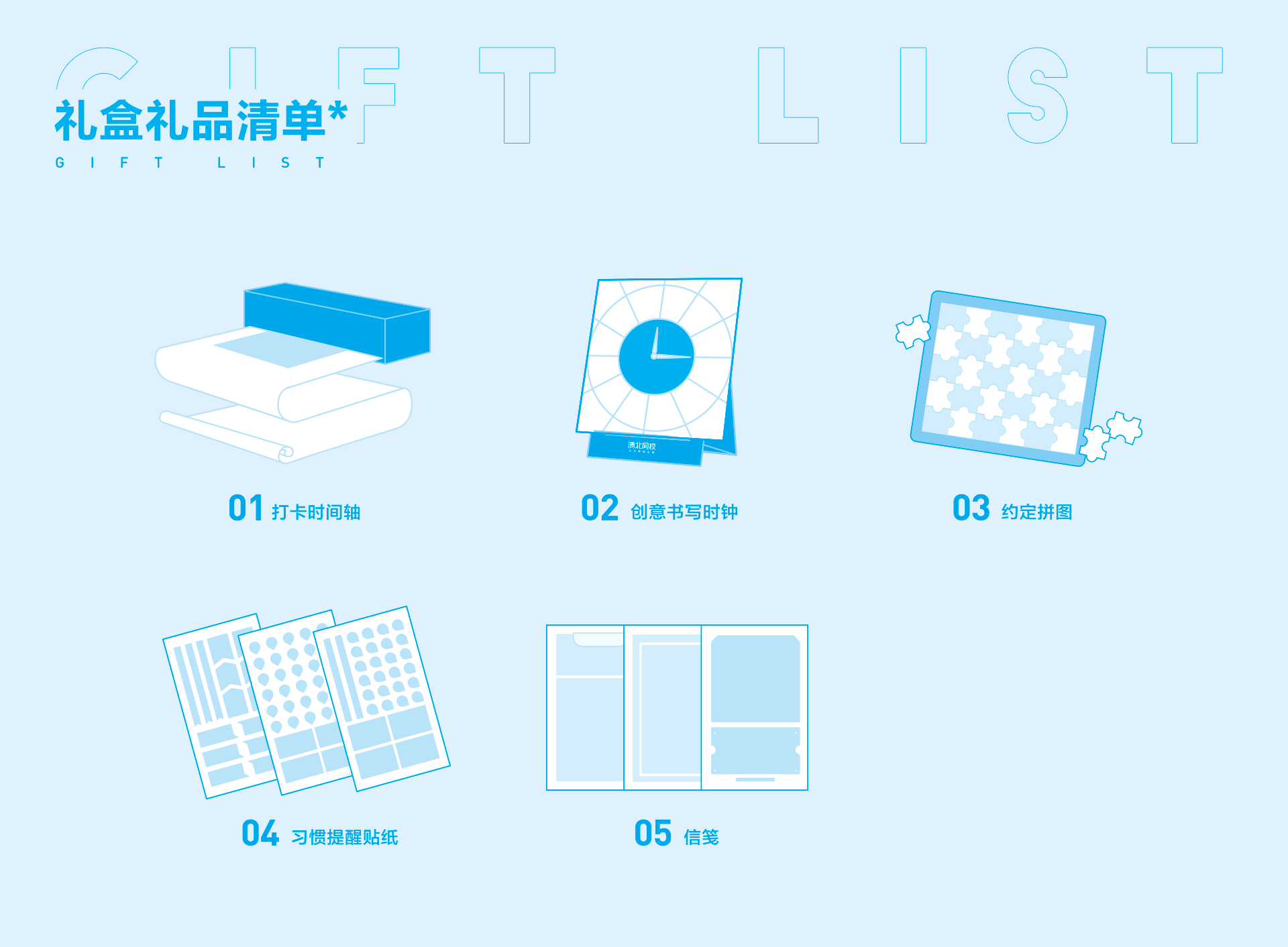 初中系统班礼盒内包含时间打卡轴、创意书写时钟、约定拼图、习惯提醒贴纸、信笺五个礼品。