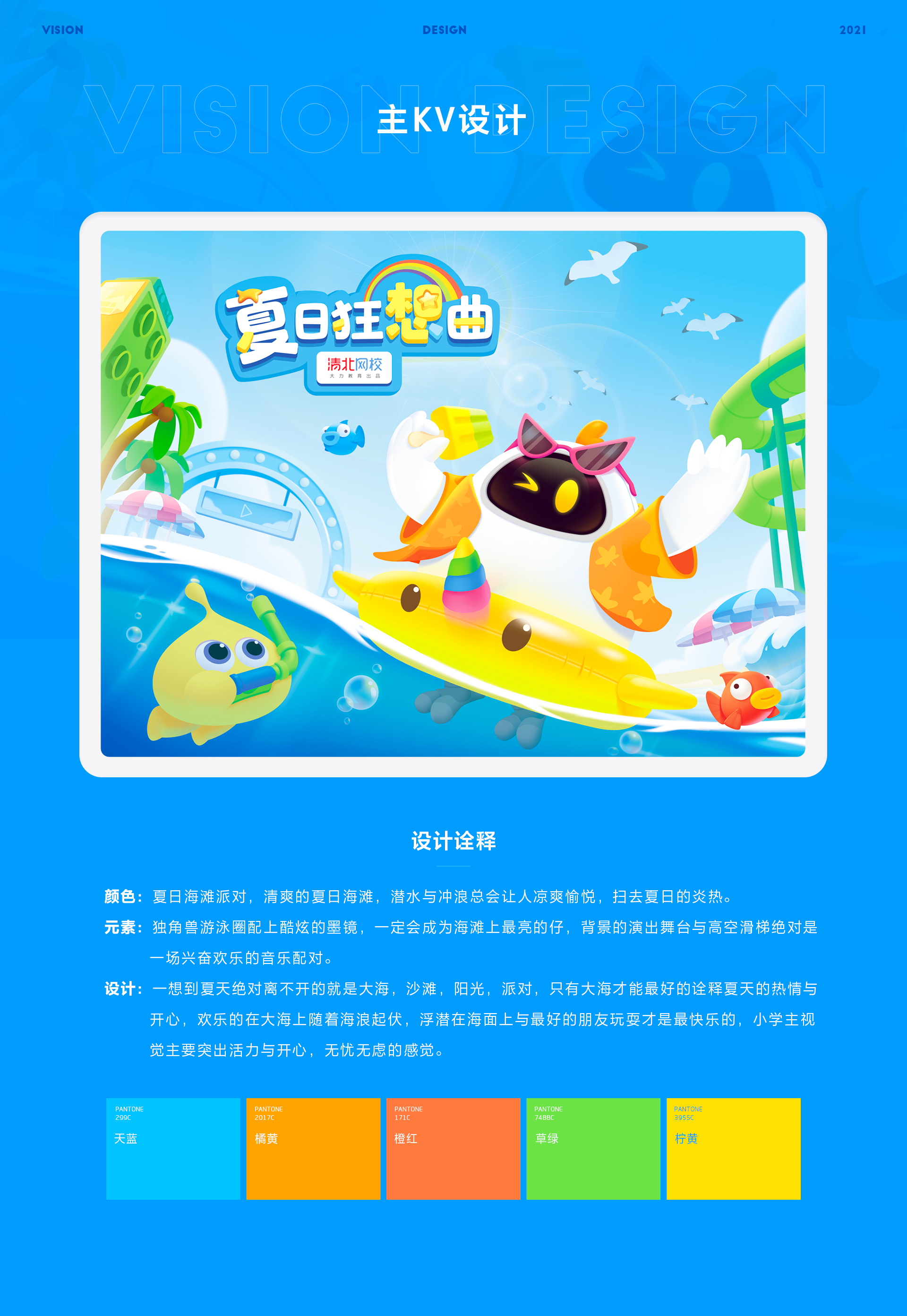 独角兽游泳圈、炫酷墨镜的罗卡、配上背景的演出舞台与高空滑梯,组成一场兴奋欢乐的夏日音乐派对,突出暑期的活力与愉悦,无忧无虑学习的视觉感受。