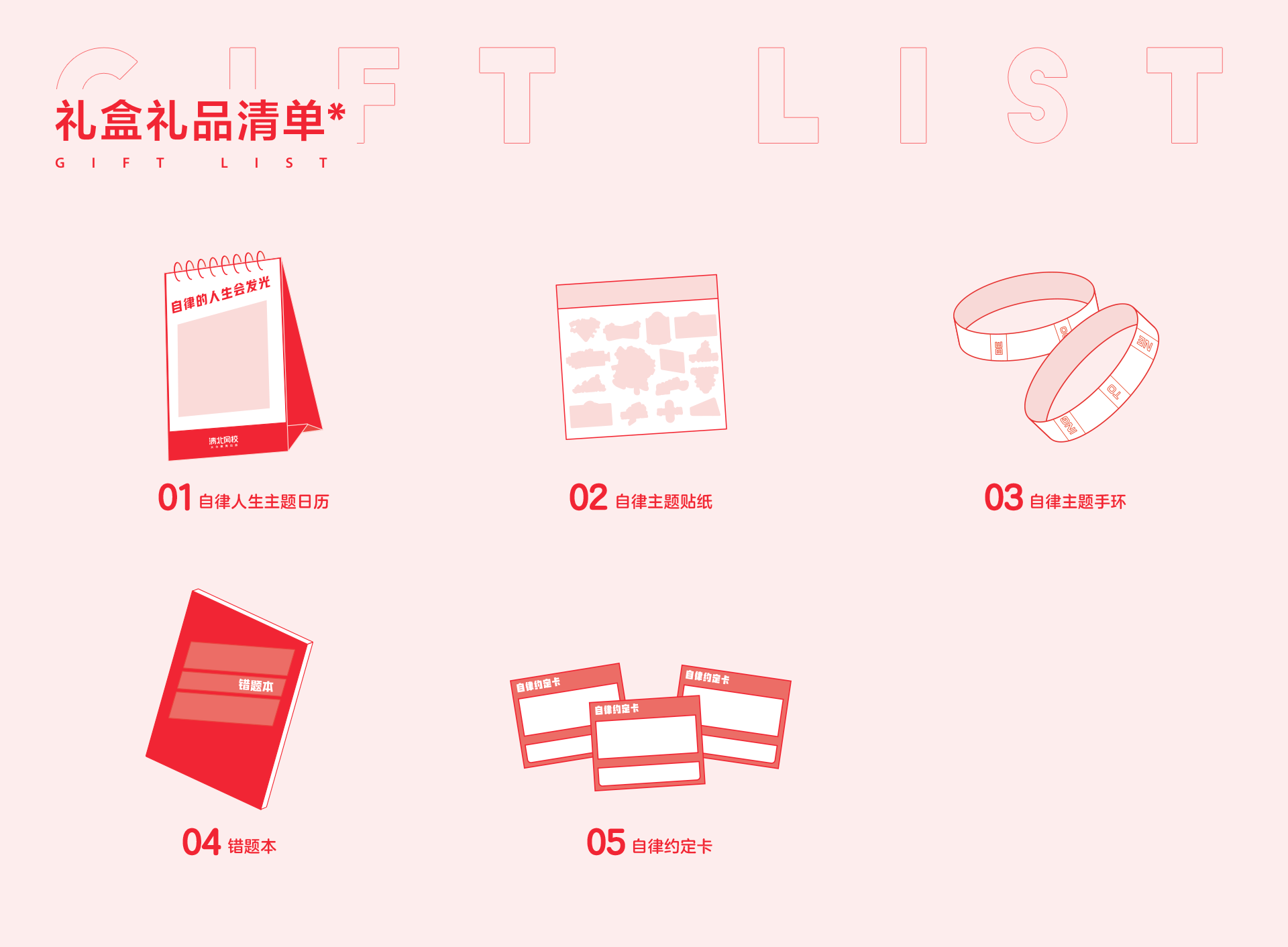 初中卓越班礼盒内包含自律人生主题日历、自律主题贴纸、自律主题手环、错题本、自律约定卡五个礼品。