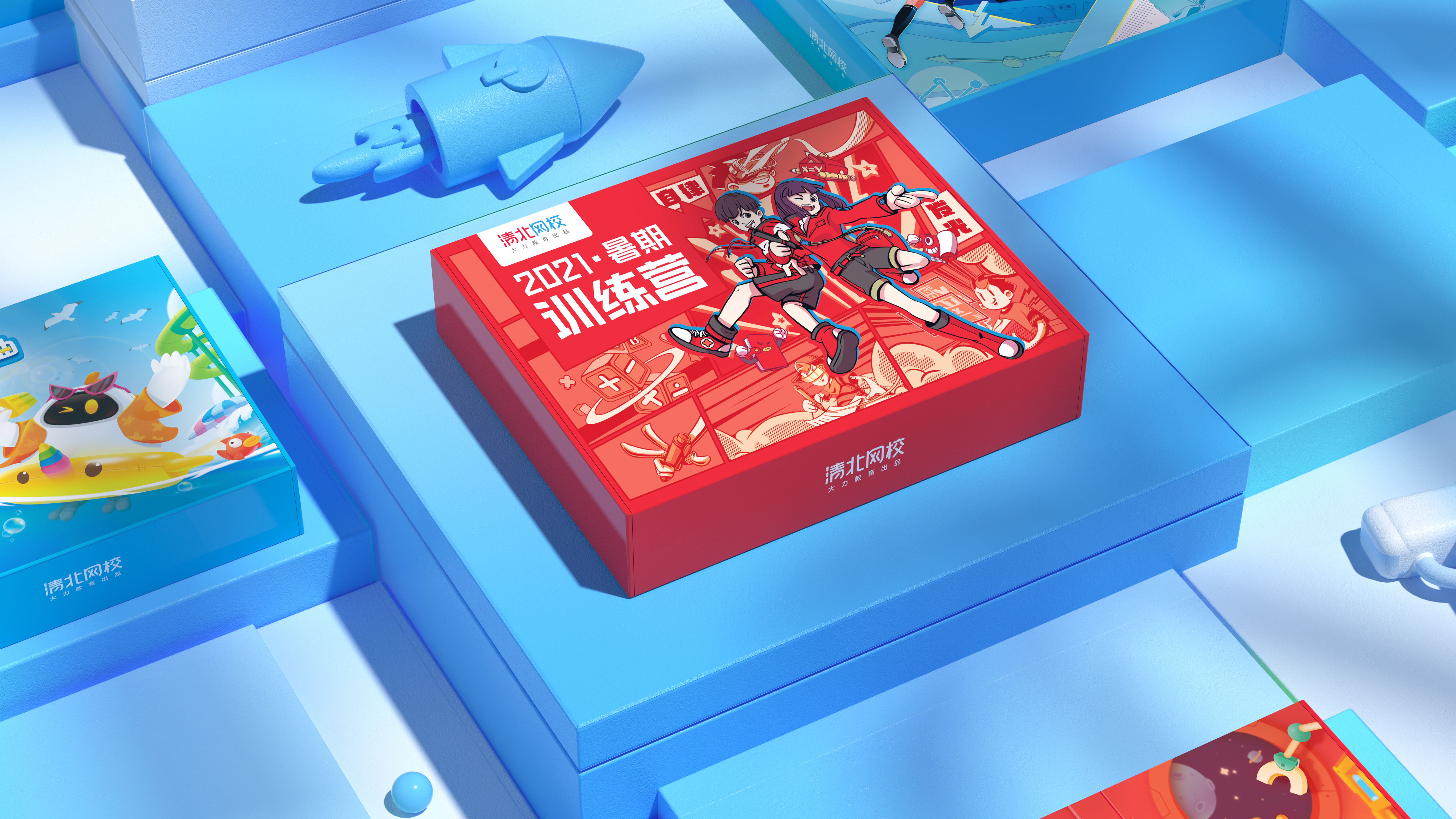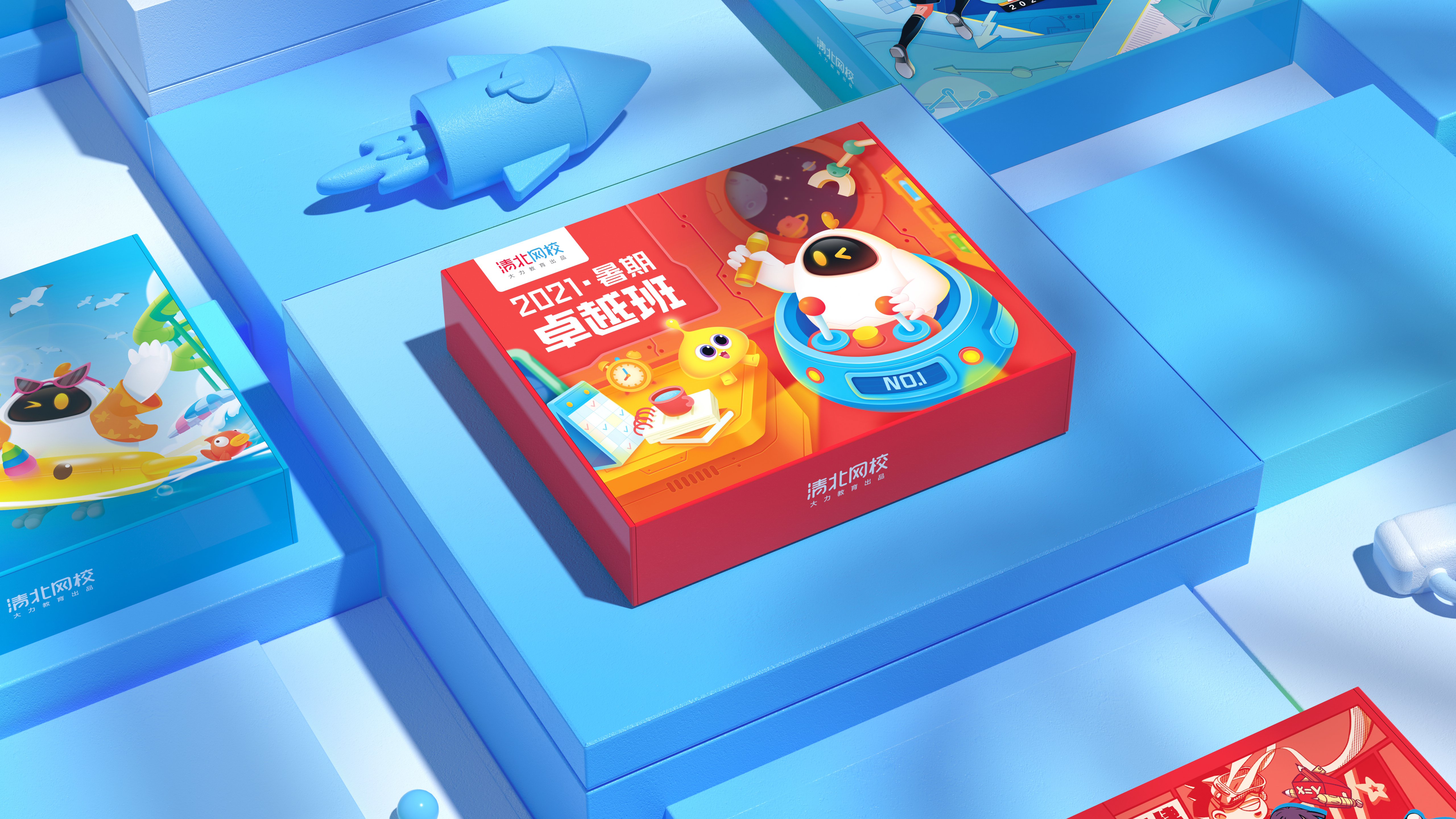 01.强化品牌记忆:在暑期礼盒中加入清北全新IP形象,让IP形象和学生建立情感关联,让IP成为学生学习旅程中的亲密伙伴;同时大面积使用红色、蓝色清北品牌颜色。