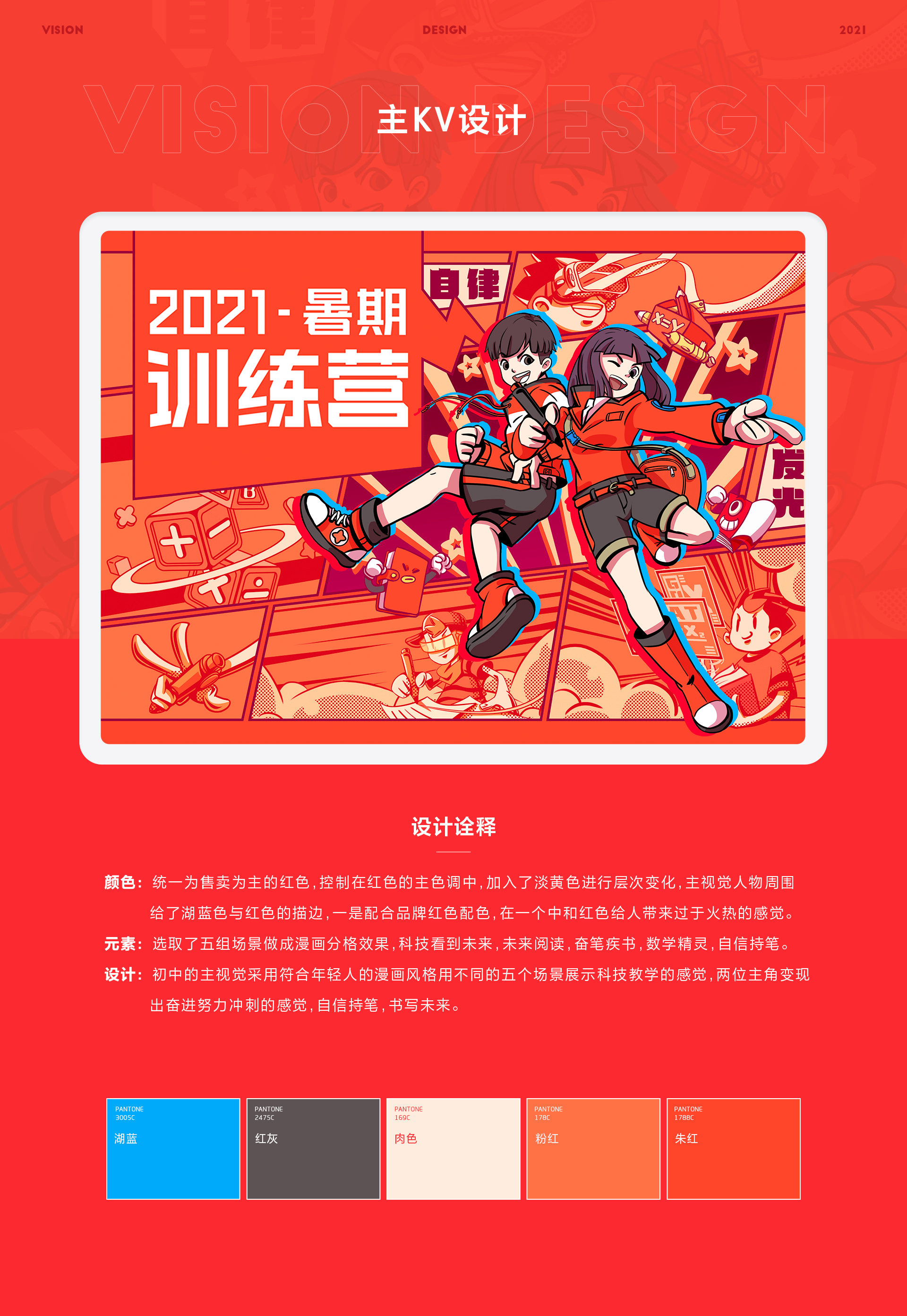 小学卓越班主kv设计以清北品牌红为主,品牌蓝为辅,设计以罗卡和丘比为主人公,还原星际旅途中的的学习场景。