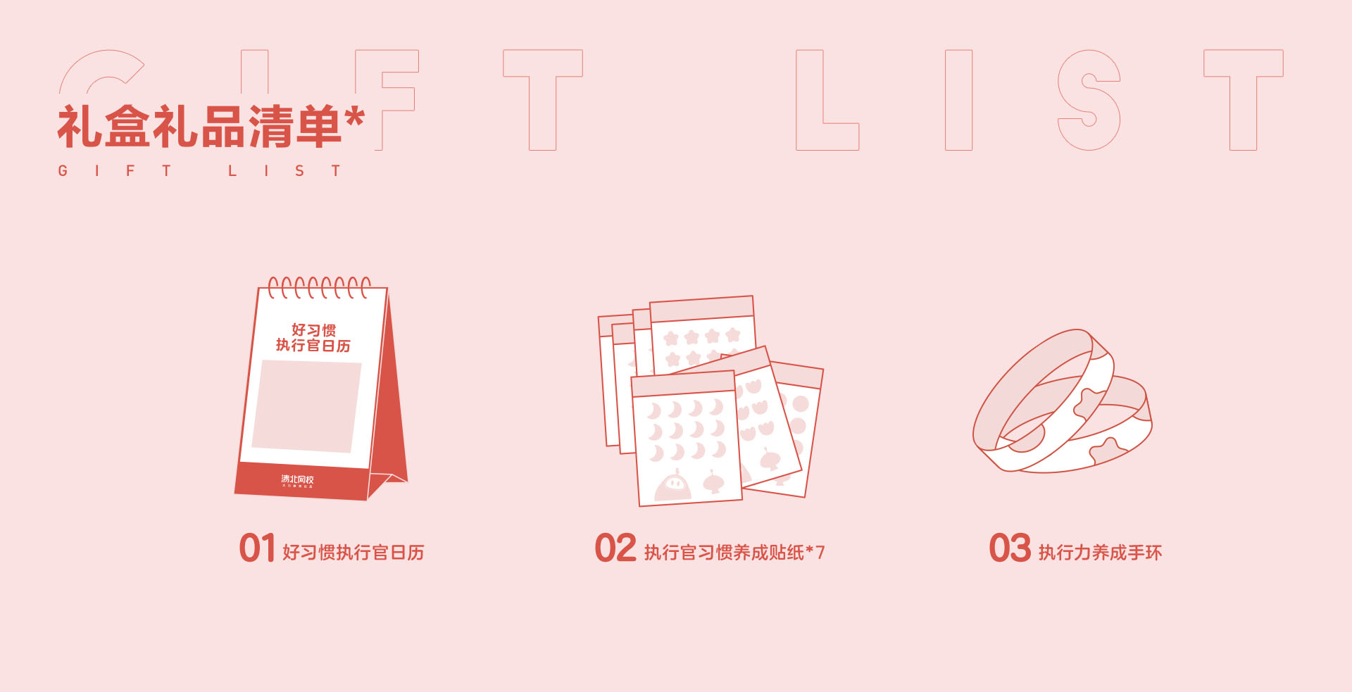 小学卓越班礼盒内包含好习惯执行官日历、执行官习惯养成贴纸、执行力养成手环三个礼品。
