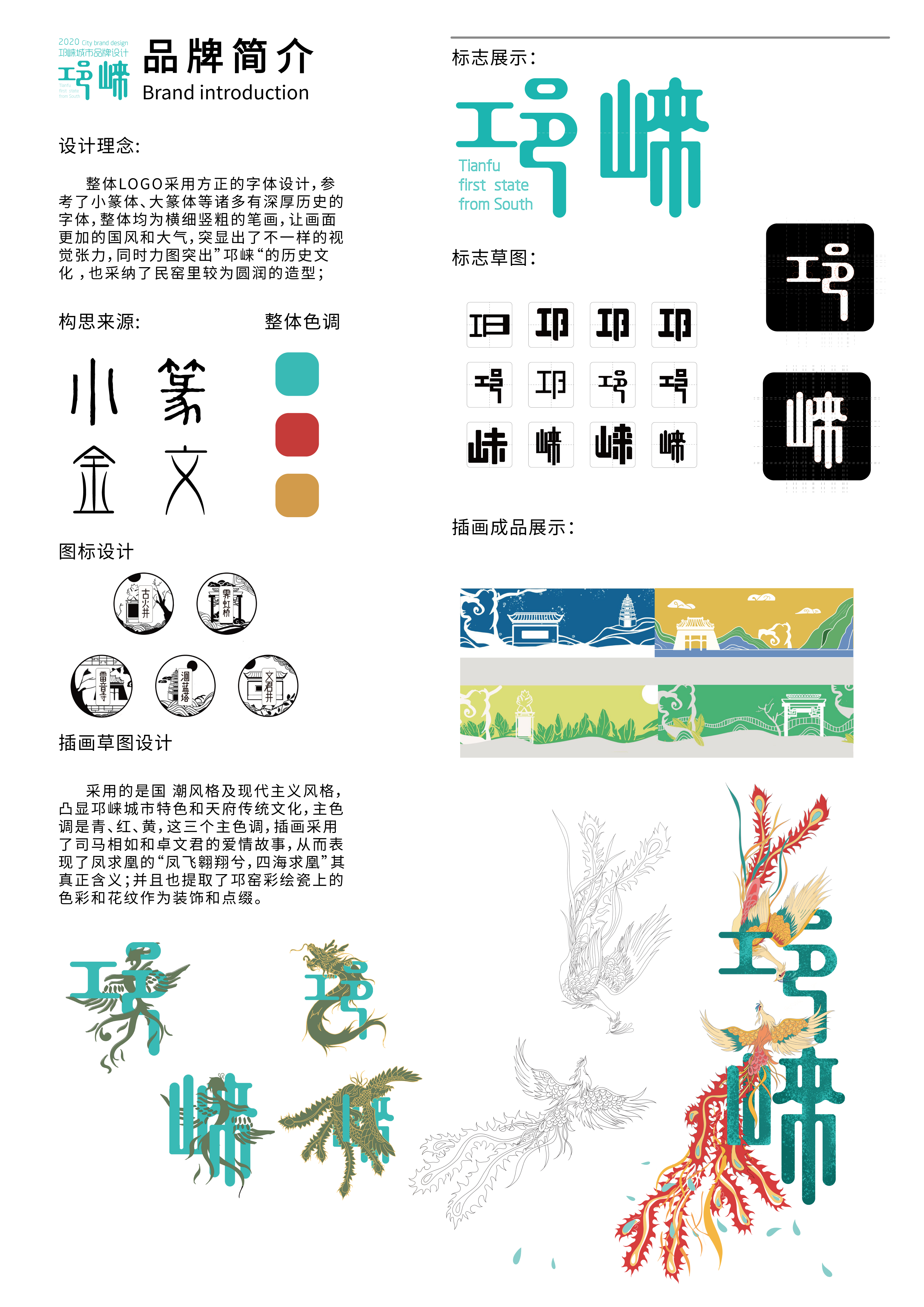 插画设计采用的是是国朝风格及现代主义风格的结合,彰显邛崃的城市特色和天府传统文化,主色调是青、红、黄。插画运用了司马相如和卓文君的爱情故事,从而表现出凤求凰的“凤飞翱翔兮,四海求凰”其真正的意义,并且也提取了邛窑彩绘瓷上的色彩个花纹作为装饰和点缀。
