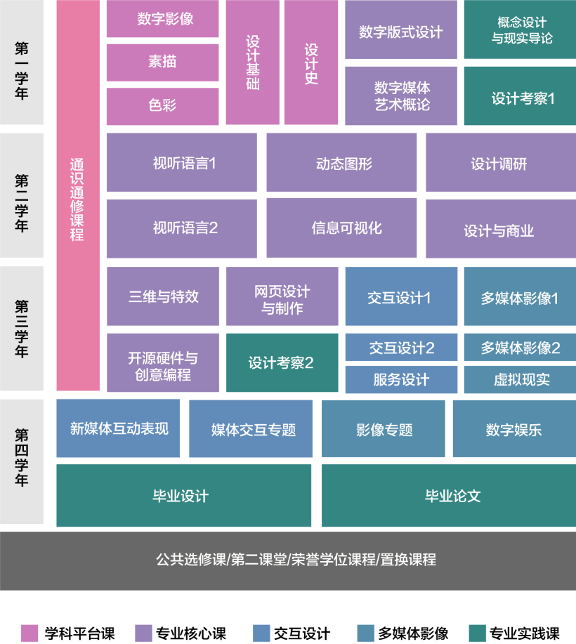 大一大二的课程以通识课程和数字媒体艺术基础课程为主。