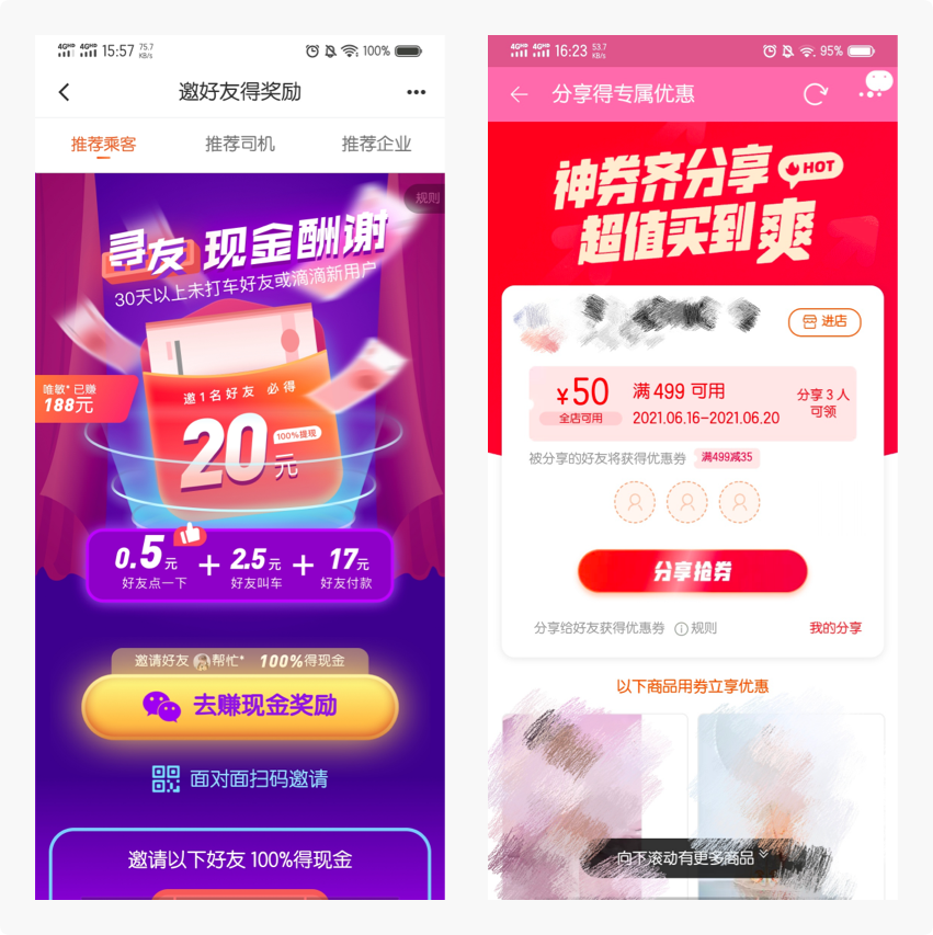 各大产品中用户被要求推荐给他们的朋友,连接社交媒体,就能得到额外的奖励的例子有很多。比如百度网盘曾经有过做任务获得额外的网盘空间、现在淘宝、滴滴、每日优鲜等app的分享领优惠券等都是相同的套路。