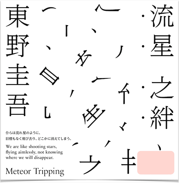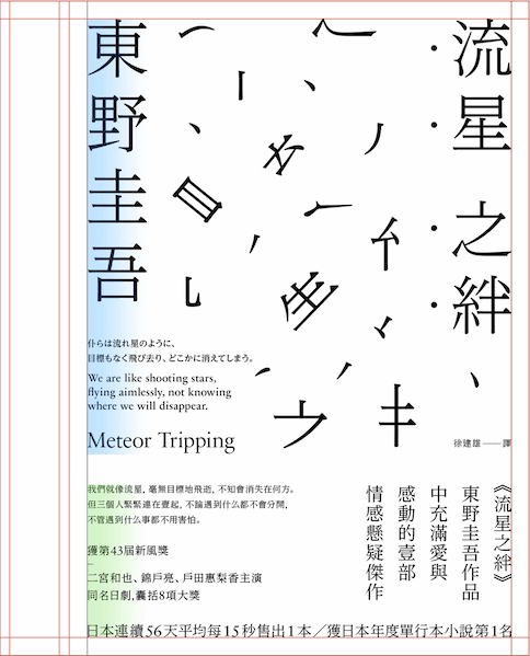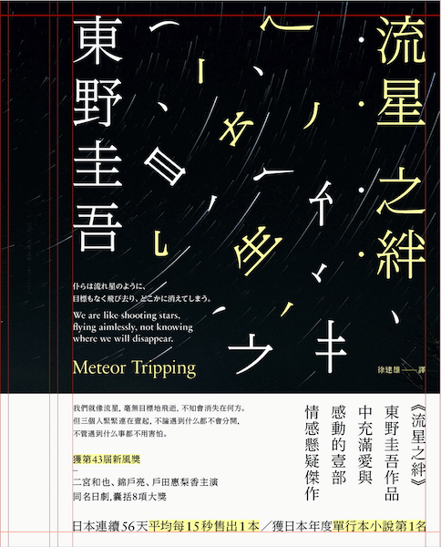 关于顶对齐的中间部分为什么要这么做,是因为标题的字数不足以作出顶对齐的感觉,为了解决这个问题,选择重复了一次标题并且将它的笔画打散了,而打散的灵感来源于“流星”,它们就像流星一样散布在天空中,不知道什么时候就会掉落下来。到这为止是书封的上半部分,下面我们来编排下半部分。