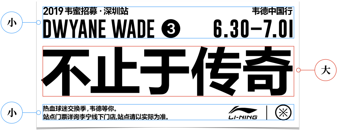 其次,顶对齐的文字字号较大,下方左对齐的文字字号较小。