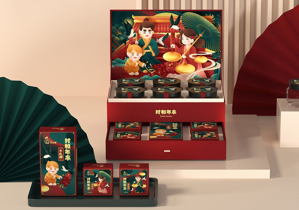 中秋节祭月后,全家人围坐一团分吃月饼,天上有圆月,地上人团圆,本身就是人们对家人亲情的情感寄托;所以包装设计展示阖家团圆的温馨氛围,场景化的画面很容易产生代入感,温情治愈的月饼包装设计,自然的激起购买欲望。