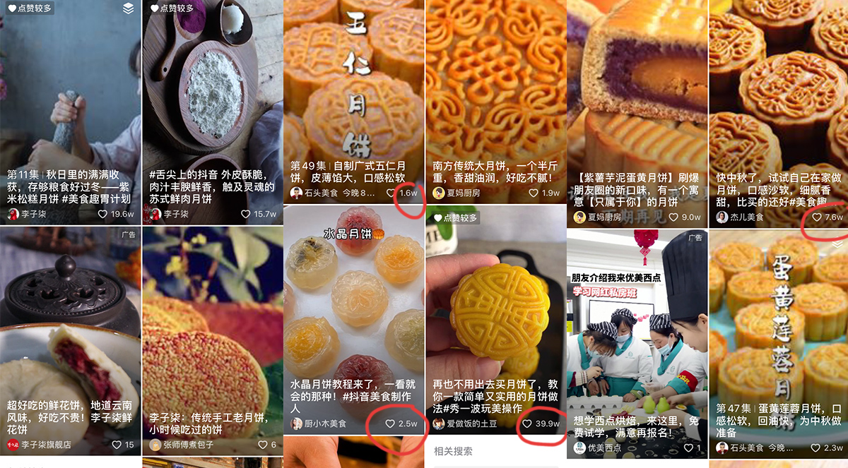 所以如果针对人群是上述这一类,那营销的方向应该是:你家的月饼是如何被做出来的,而不是一直吆喝“你家的月饼有多好吃多健康”;这一点从抖音平台上“月饼制作”的发布数量和用户点赞数,可以看出一些端倪。