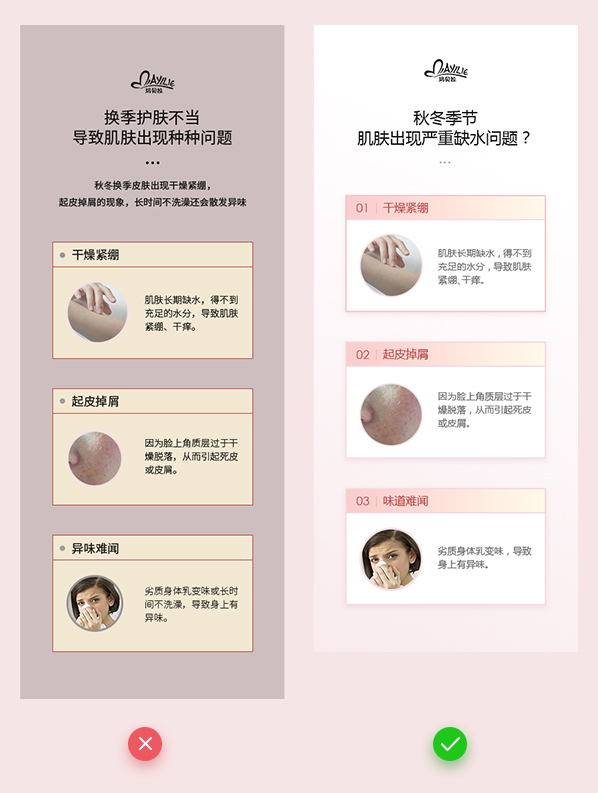 一个好的详情页设计,在细节上一看就能看出是否是一位成熟的设计师做的。一个买家的购买决策一般来说只有15S,停留时间非常重要,所以在排版和画面表达上最好一眼能让消费者秒懂,让消费者在最短的时间内了解信息内容,在牍面中也占具着重要的位置,买点内容不同,排版方式也不同,那么,如何在我们的详情中加一点点细节就能使画画更加美观,更加秒读呢?接下来给大家讲解几个案例的修改。