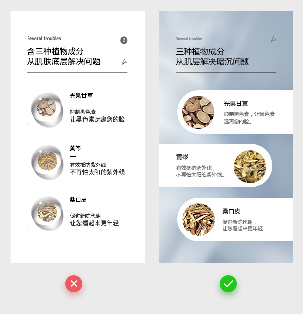 以下案例是一个是白色背景,一个是有色背景,明显能够感觉到右边丰富一些。当然下面的图文排版也是一项加分项,导致我们看着右侧舒服一些。因为左侧成分图片太小了,所以显得太小气了。