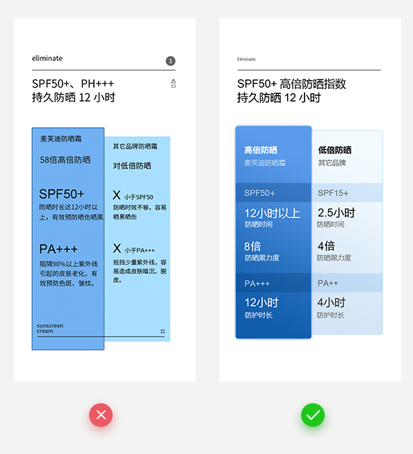 在下面案例当中,先将对顾客有帮助的信息罗列出来,“防晒时间”才是最重要的,而”SPF50+++“”PA+++”做为一个妹子,其实不知道防晒效果如何,只是猜测大概是一个防晒等级,所以着重把防晒时间、防晒力度突出。