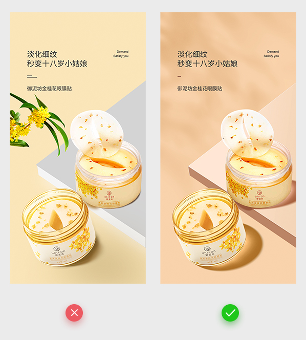 以下案例是一款身体乳,产品外观是粉色的,所以在背景选择的浅粉色,标题比较醒目,同时也增加了一些投影,显得整体画面更加丰富饱满。而修改前使用的是很深的灰色背景,显得画面特别素特别脏,不够丰富。