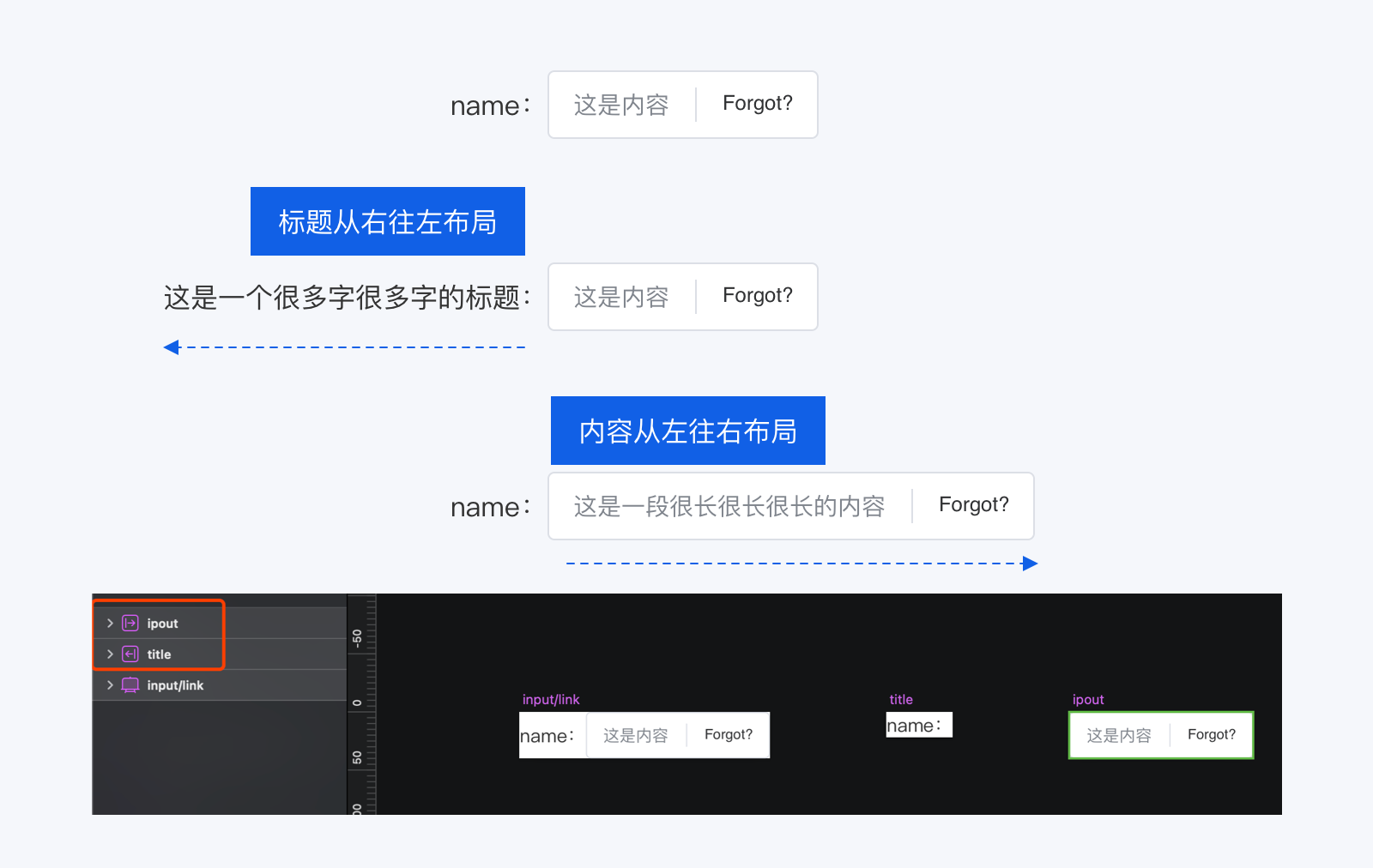 比如在项目中会涉及到一些筛选框、输入框等,会出现标题文本右对齐、内容文本左对齐的情况,这时在做组件的时候就要定义不同的布局样式。