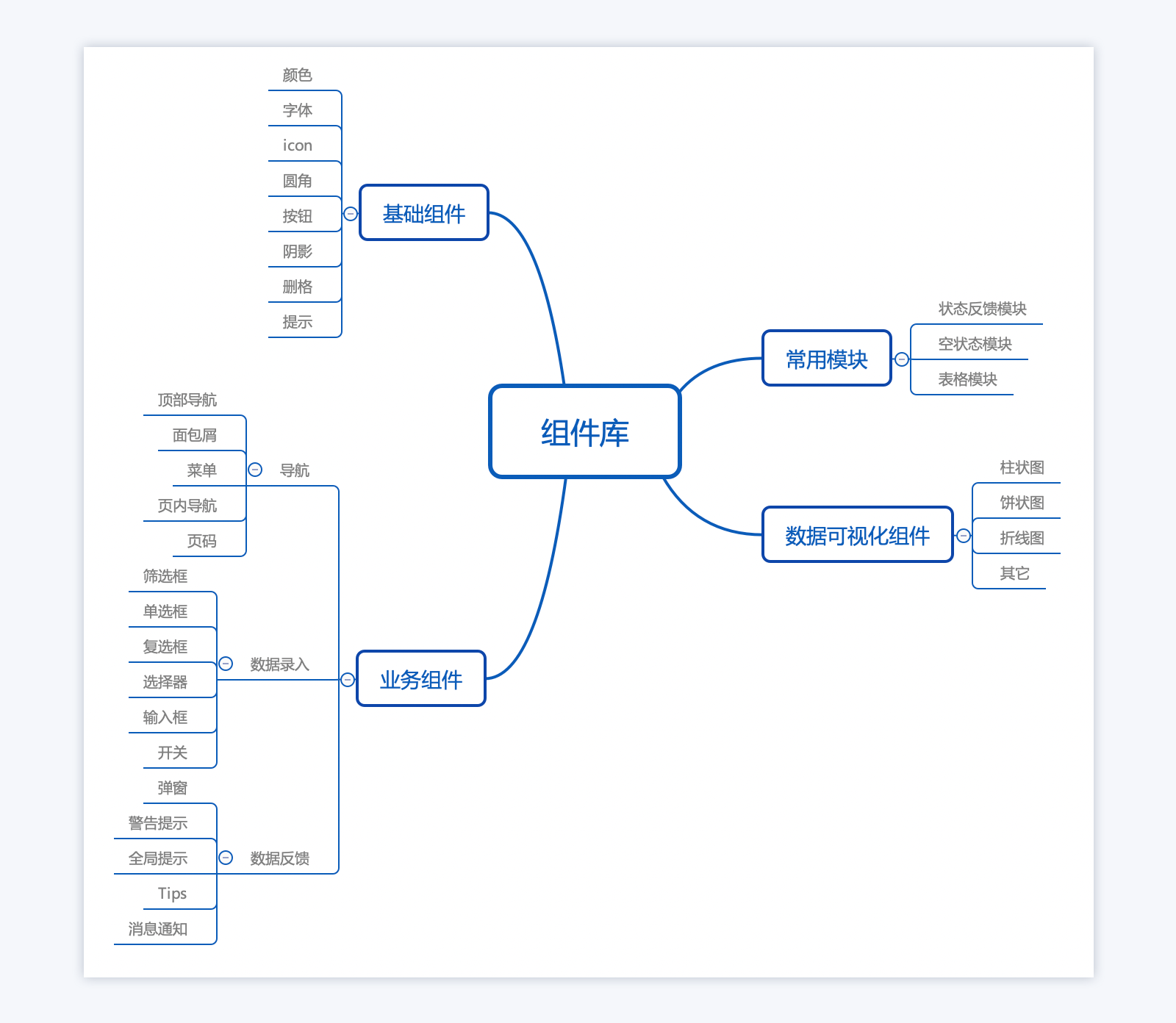 B端组建库的建立,主要把组件概括为四大类:基础组件、业务组件、数据可视化组件、常用模块。具体细分见思维导图: