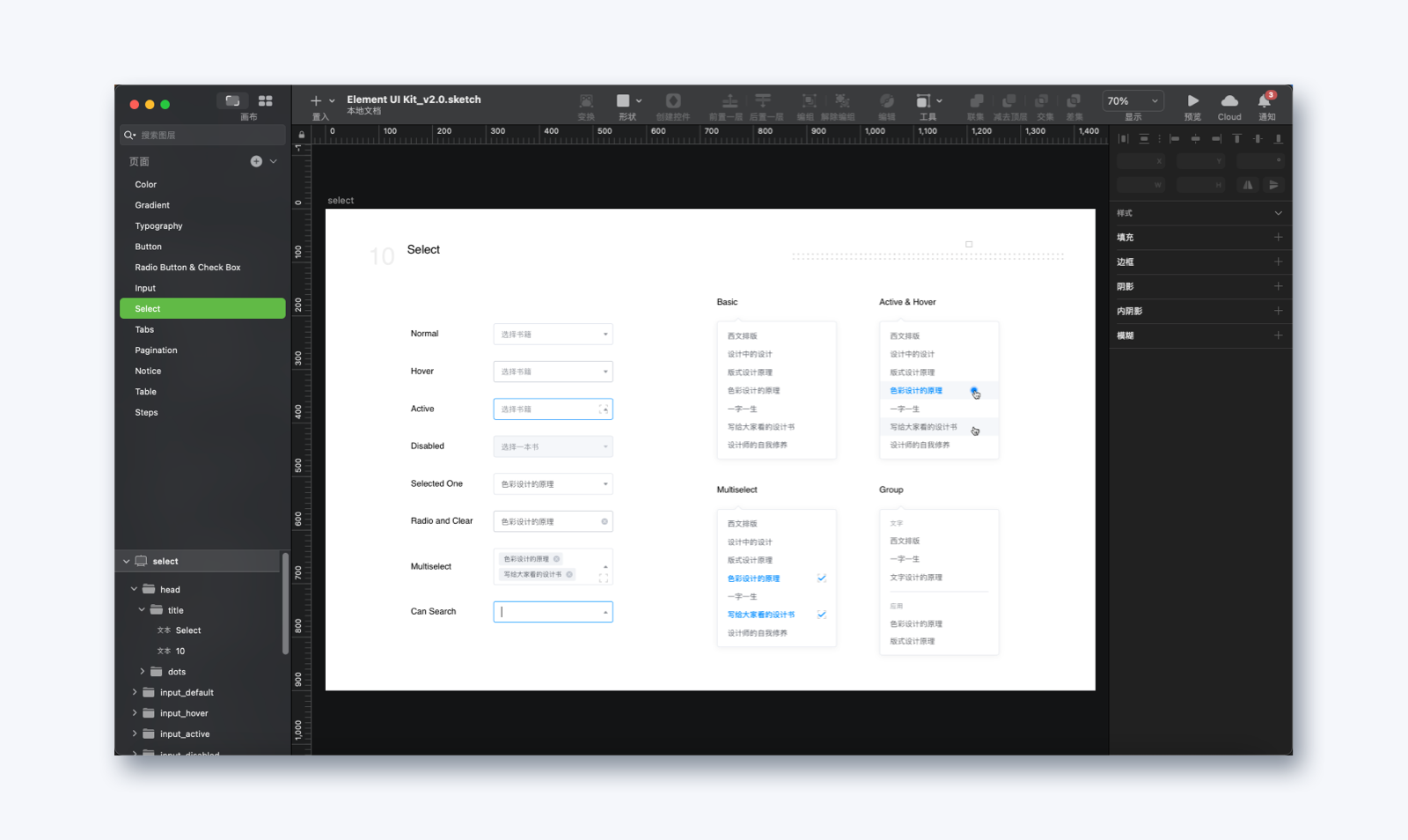 在产品中,图标通常有多种尺寸,我们一般会为每个尺寸的图标各创建一个frame来进行管理,其中,我们会把同一个图标的填充版和描边版创建为一个组件集,这样在调用时可以直接控制图标的填充和描边,在做有选中态和非选中态的组件时尤为方便。另外,在命名上,我们会用图标的内容为它命名而非表意,例如一个灯泡的图标,我们会直接命名为灯泡而非创意。