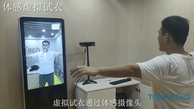 虚拟试衣系统是一个利用体感控制与人体识别结合的操作系统,通过体感摄像头实时捕捉现场影像,并结合体感探测装置将服装的3D模型叠加到体验者的影像上,虚拟服装大小随试衣者身形自动适配,参与者可以通过该系统体验穿戴不同时期警服,同时体验者伸手可以拍照留念。