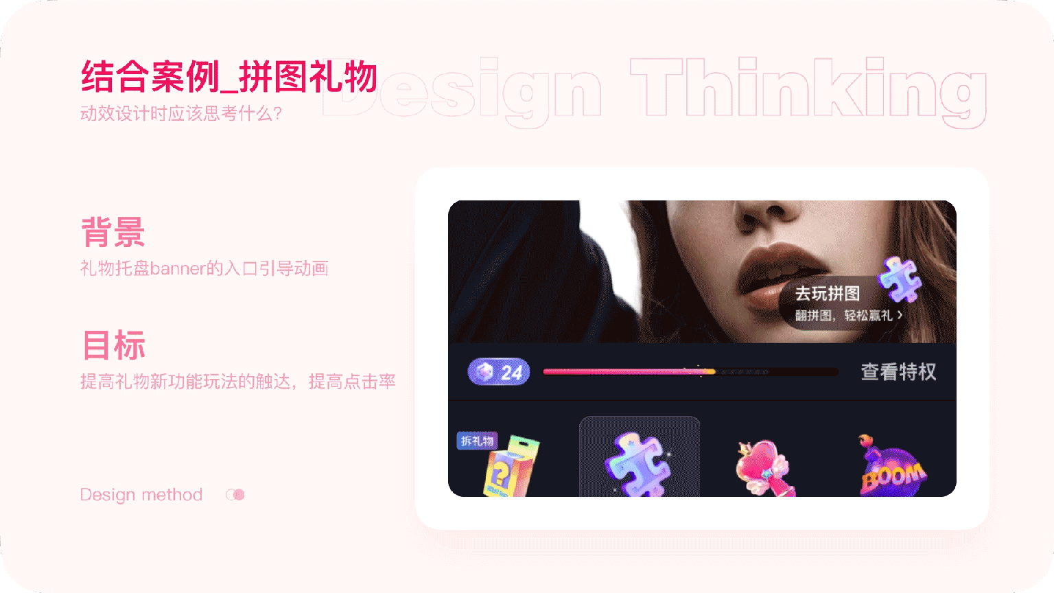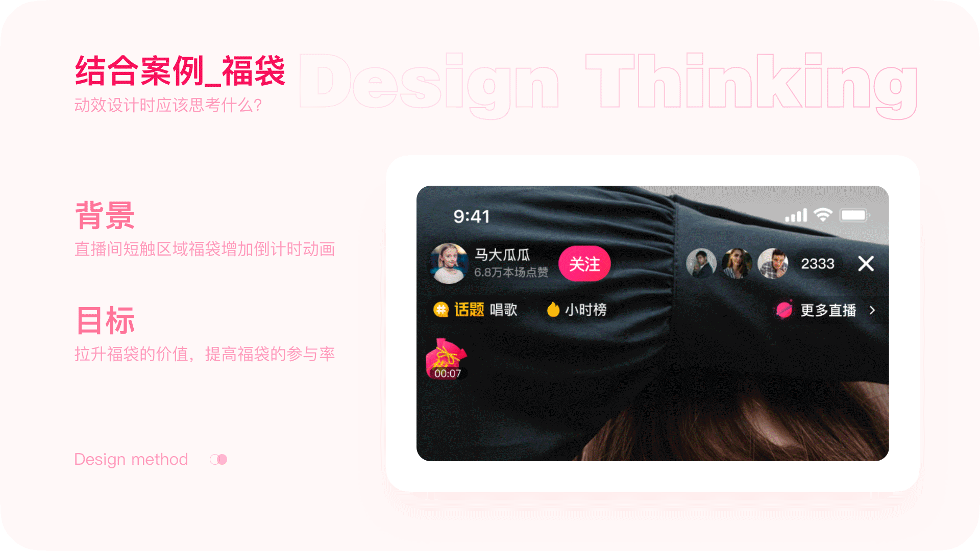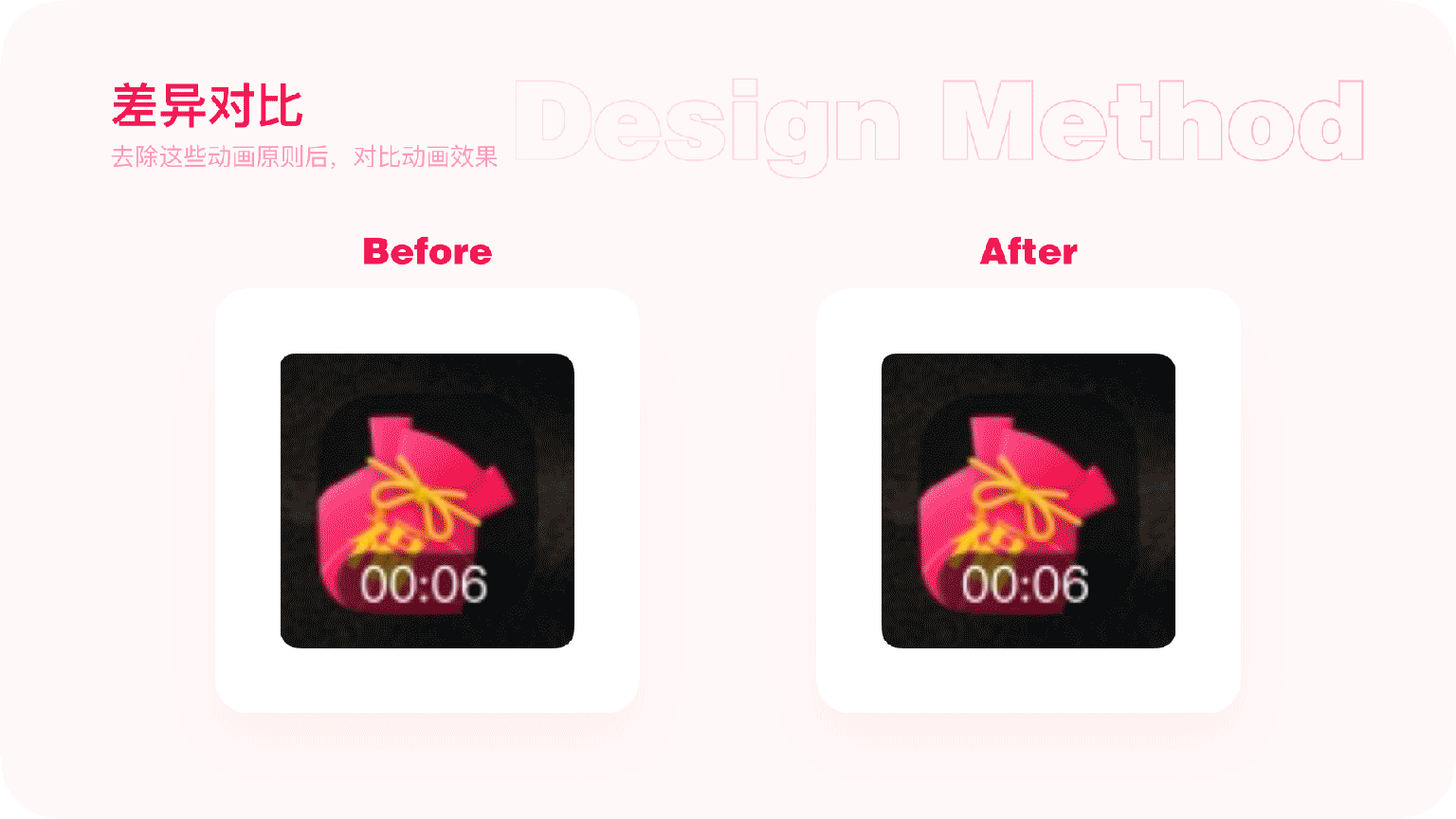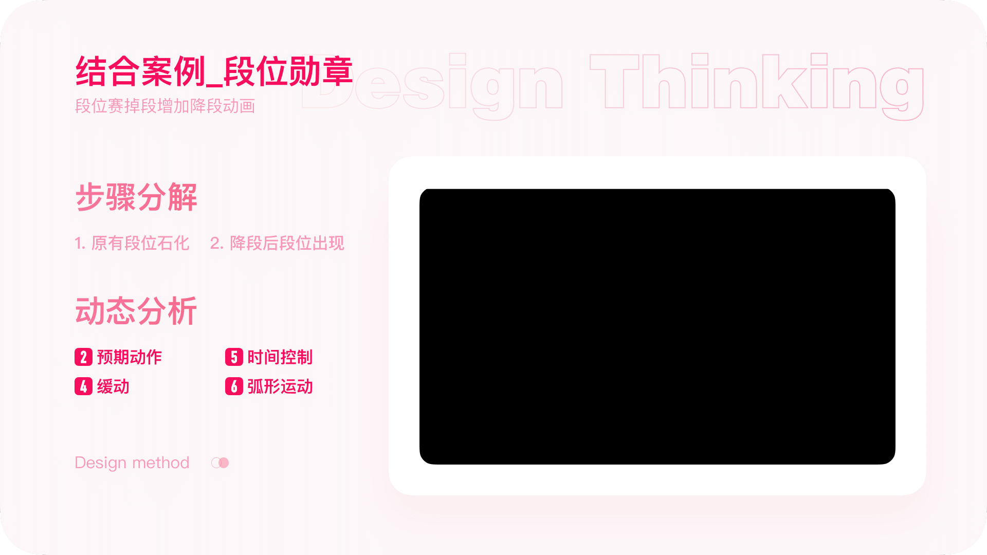 最后就简单总结一下动效设计的方法。一共拆解为四步,首先确定好需求方的目标和预期。然后再进行具体的脚本步骤的拆分,然后再聚焦到每一步需要用的的动画原则。最后再开始动效设计。设计前对需求进行充分的思考,让动效在助力业务发展的同时也能够做到有理有据。