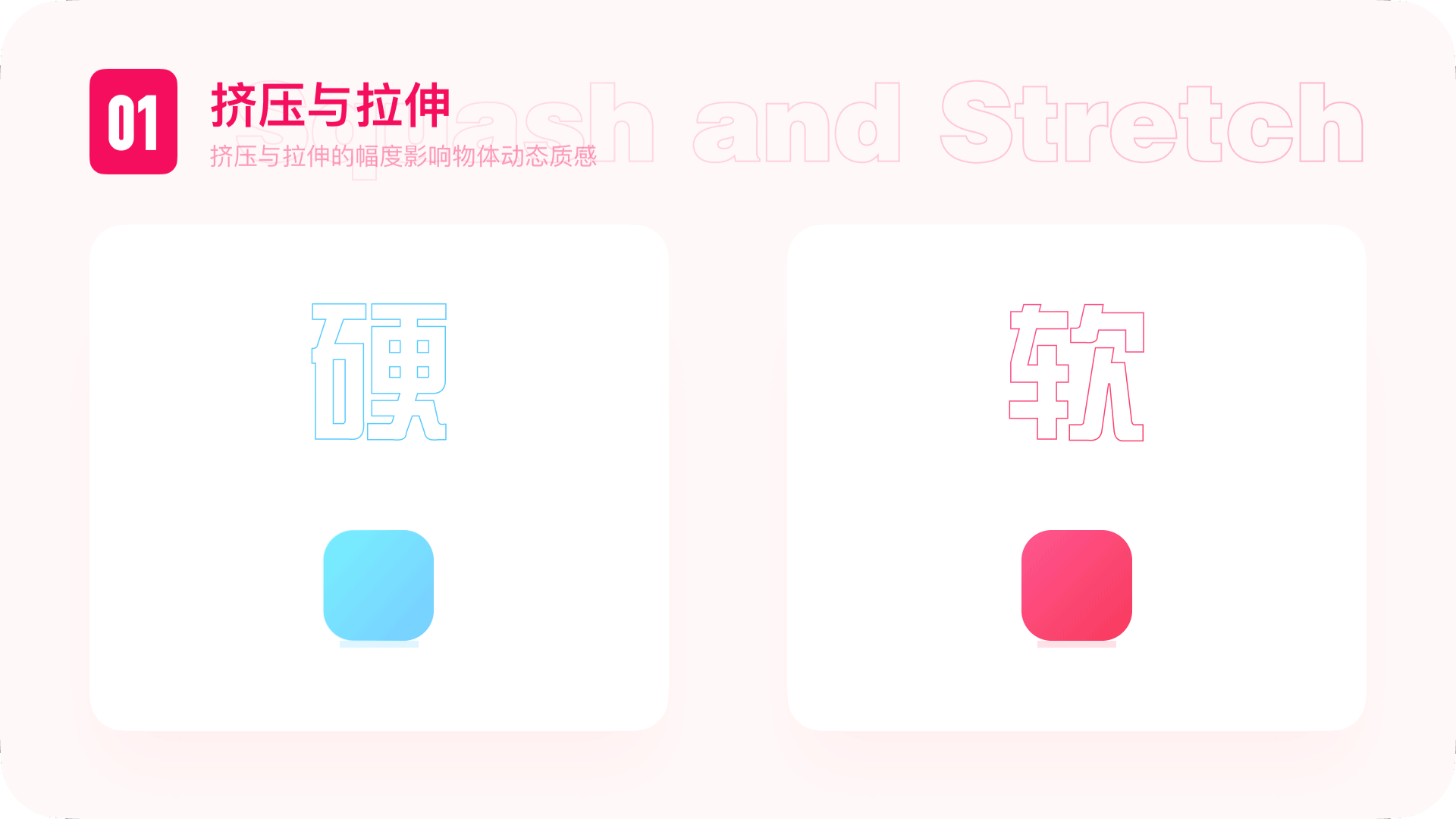 【挤压和拉伸】是动效设计中最常用到的设计技巧。使用挤压和拉伸来强调物体的质感、重量、速度。我们可以根据物体的质感去决定挤压伸展的具体幅度。可以很好的表达出不同物体的不同质感。这里需要注意的是,物体挤压拉伸的面积尽可能保持视觉统一。以免动画前后造成不协调。