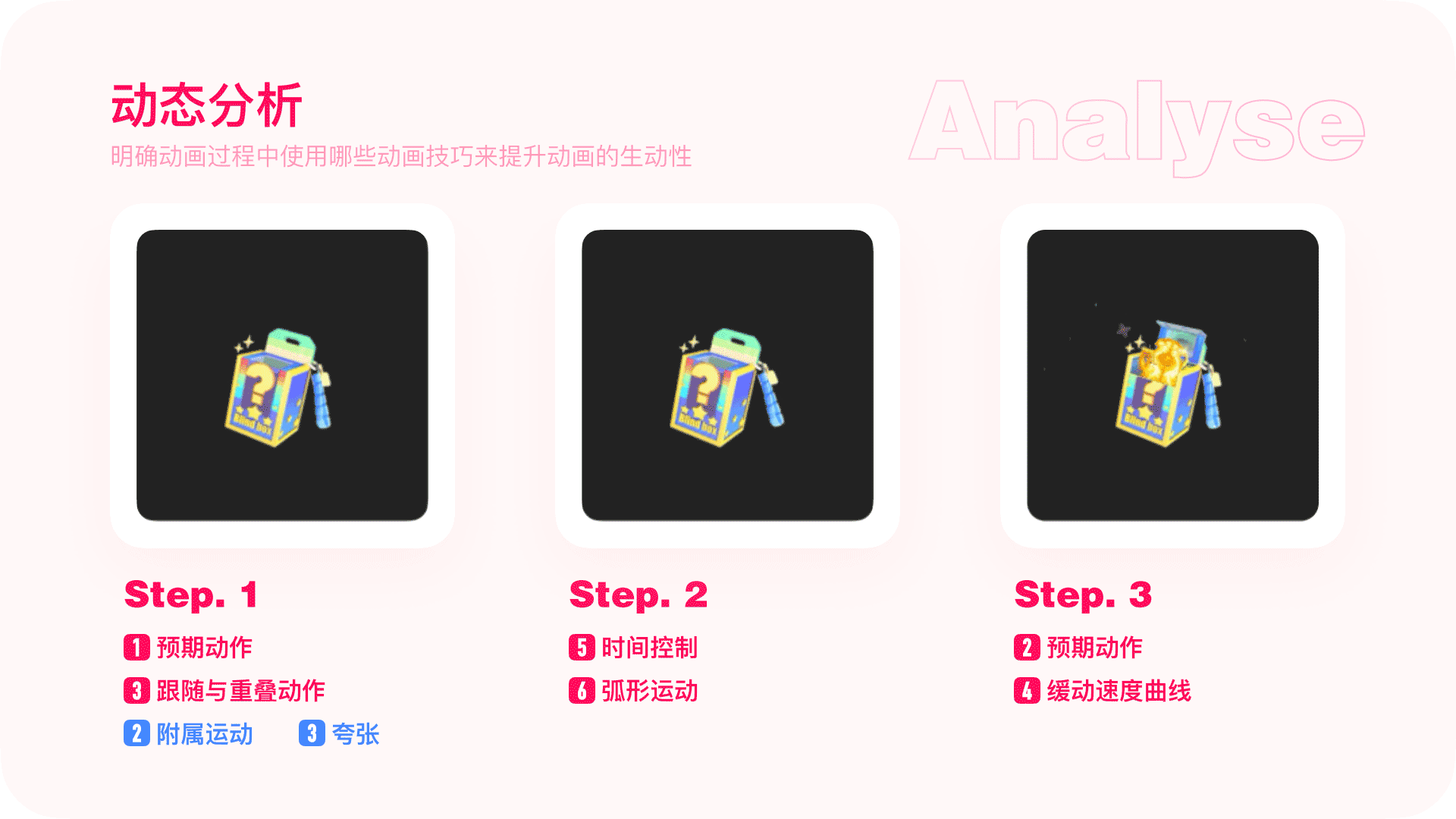 先拆解动画,再分析需要运用到的动画原则。这里主要说下不同点,第二步中用到了“弧形运动”的原则。‘盲盒喷出的彩带和星星会有‘不同的’速度,速度快的元素运动的路径会比速度慢的更平滑一些。