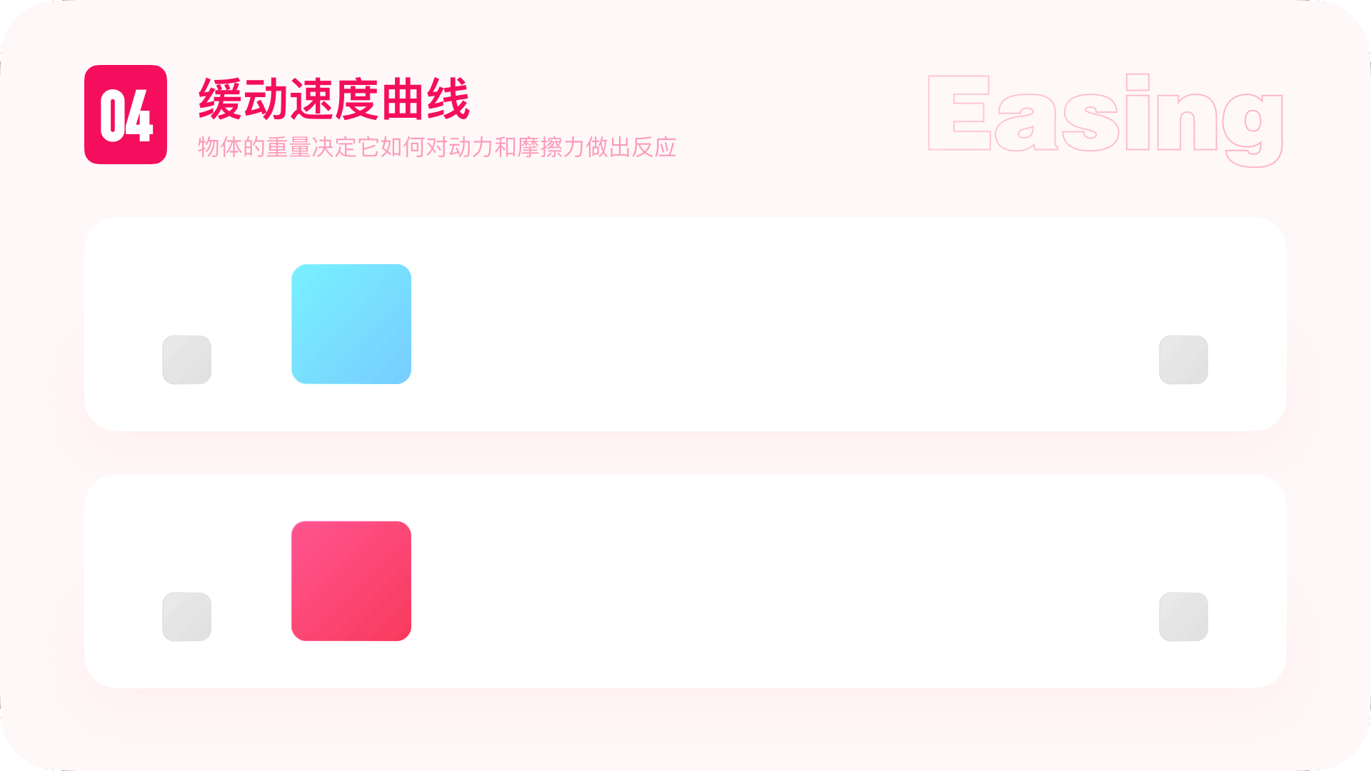 【缓动速度曲线】动效设计中最离不开的参数。不同的速度曲线也会给人不一样的感受,运动曲线较陡会感觉元素的质量更重冲击感更强,比如适用于我们竞争向的场景中。反之较平缓的曲线元素运动则较为轻盈。更适用于我们关系向的场景。