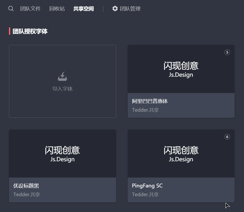 我们将原有的导入本地字体功能添加到了团队协作的流程,只要将团队字体上传到共享空间,即可建立一个专属的云端字体库,凡是加入团队的成员都可以同步使用,不再需要每个成员都单独下载安装。