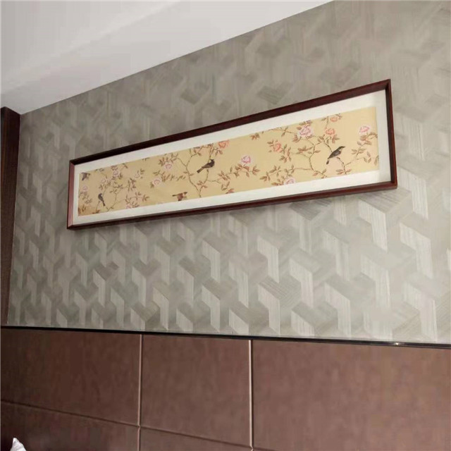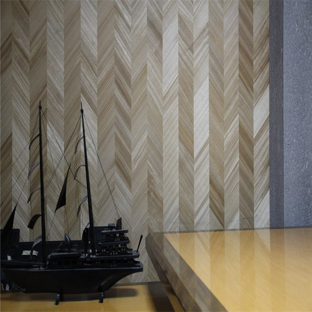 天然的木皮壁纸来装饰房间背景墙。木皮雕花墙纸,采用天然木材,经过木材刨切,雕花,手工粘贴,木皮与底基双层粘合等多道工序而成。手感质朴自然,外观华丽,高贵典雅。纯天然材质对人体没有任何化学危害,透气性能良好,是“会呼吸的壁纸”,是健康家居的首选。