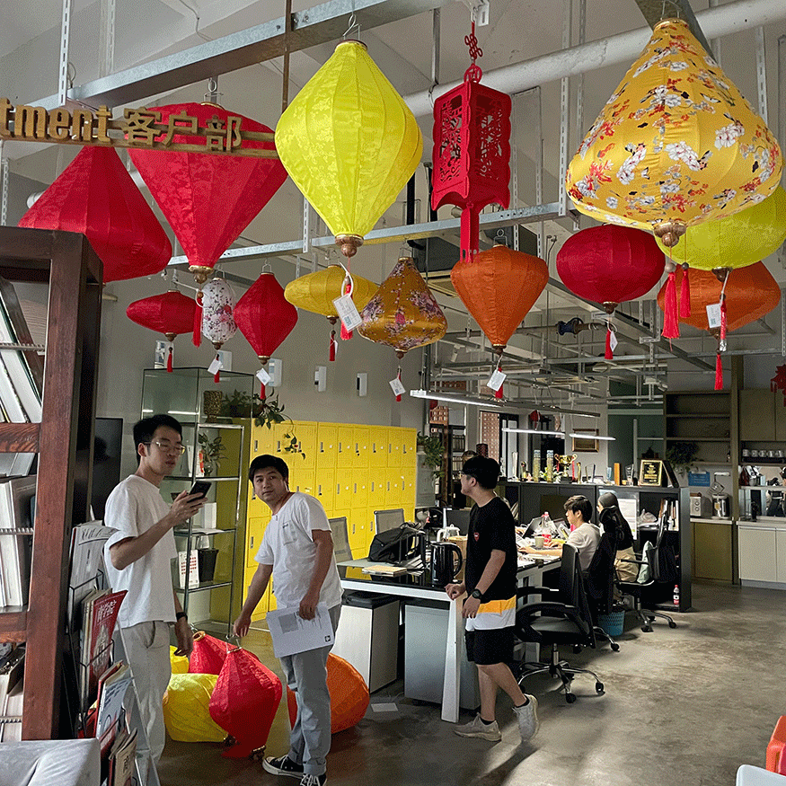 为保证效果及顺利落地,我们甚至采购了各种样式的灯笼寄到公司来大家一起选品,没有合适的干脆陪着甲方去供应商工厂里直接挑选。