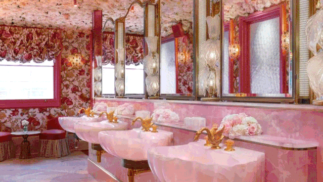 天花和墙壁镶嵌着手工制作的丝绸花朵,辅以淡粉色的玛瑙水槽,以及带有欧式造型的金色镜子边框和壁灯,尊贵奢华的气质凸显无疑。