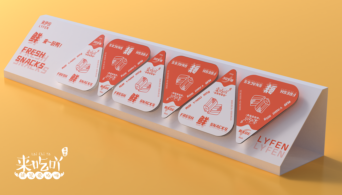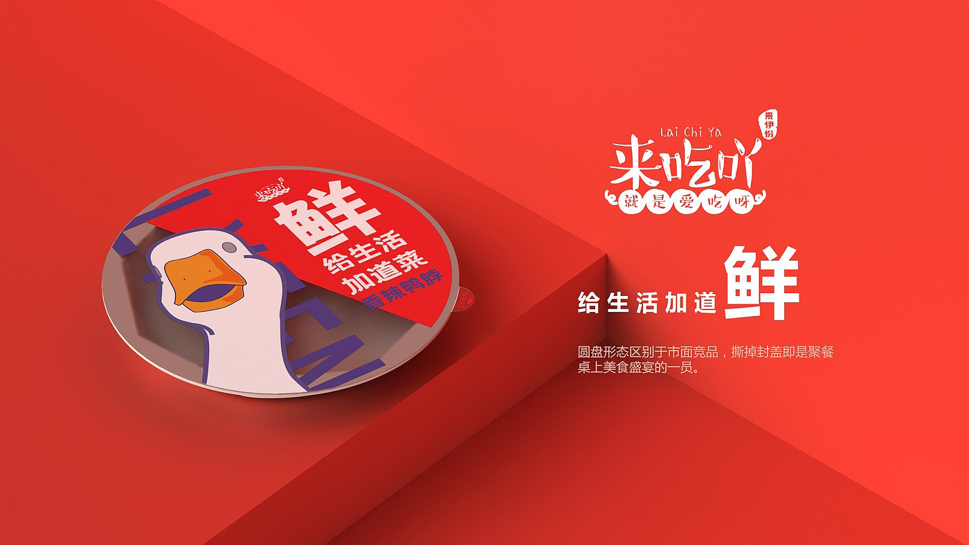 八边食盒款采用了中国传统餐具锦盒的八边造型,八象征着八方来客,兼容并蓄,雅俗共赏的包容态度,与来伊份的品牌文化相符。圆盘形态区别于市面锁鲜装,鲜活鲜食,撕掉封盖即是聚餐桌上美食盛宴的一员。底部贴纸内附纸巾手套包,提升消费者食用体验。活力鲜食,运用高饱和的明艳色彩和可爱年轻的鸭子形象提升视觉吸引力。