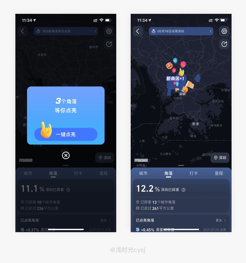 高德地图点亮城市功能应运而生,打开高德地图会自己帮我们记录去过的城市,乡镇,街道等信息。我们可以在如何时候进入点亮城市功能,将自己去过的位置信息进行点亮,看着地图上亮起越来越多的地方,心中不免会产生一种成就感,点击点亮按钮的时候会弹出动态的表情包,像是一种鼓励与认同,表情包的动态表达方式,增加了产品的亲和力和趣味性,能拉近用户与产品之间的距离,并建立起更深层次的情感连接。