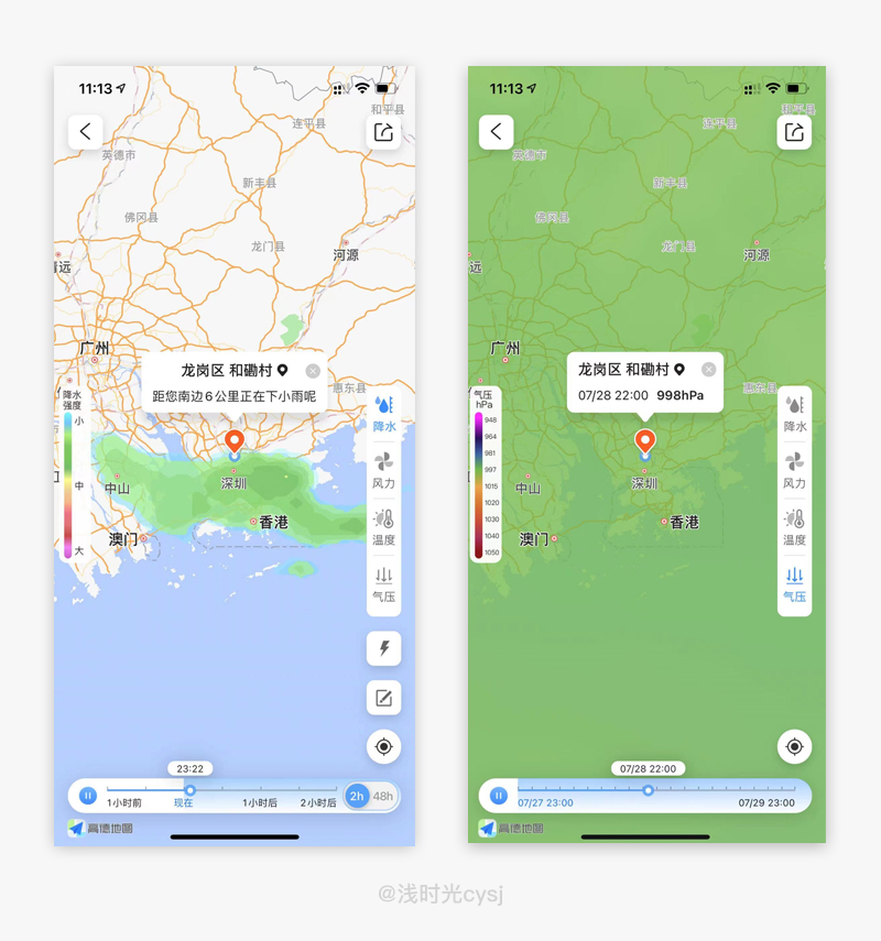 进入墨迹天气,点击右下角的小地图,用户首先可以看到当前定位所在区域及周边的降雨、风力、温度、气压情况,降雨从一小时前到四十八小时,另外三者则显示未来24小时内情况,每隔一个小时轮播显示,并用卫星云图实时显示。采用动效、文字、分时进度条相结合的方法,用户可以直观的感知到降雨量的变化,从而判断否可以出行。把有趣的内容和功能部分直观地凸显了风格化与趣味性,不仅增强用户的吸引度以及空间感,比单纯静态图标有更丰富的细节与趣味性。
