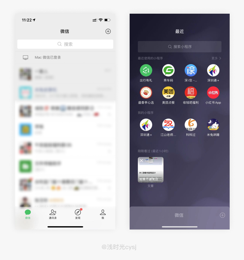 在微信中,当我们使用过一款小程序或在公众号浏览过一篇精彩的文章时,我们可能会因为其他的事情中断,返回微信继续处理我们手头的事情,当我们处理完事情之后想要查看公众号或小程序时,通过微信聊天界面下拉进入最近使用功能,可以极大的节省用户的时间,提高查找效率,提升用户体验,拉近用户与产品之间的距离,从而提高用户粘性。