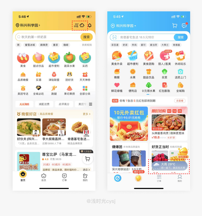 美团/饿了么不一样的天气提醒方式,美团的天气提醒在首页的右上角,而饿了么的则在右下角,直观的天气展示给用户带来心理暗示。