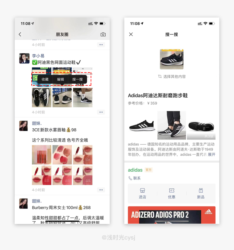 在刷朋友圈时看到别人分享还不错的商品,可长按图片,搜一搜识别该商品,即可获取该商品的信息。