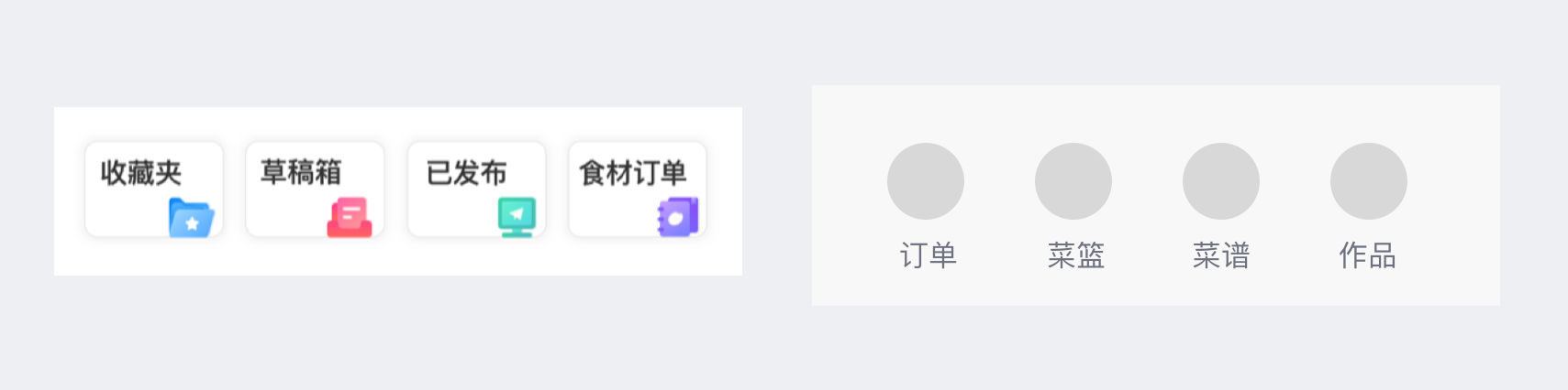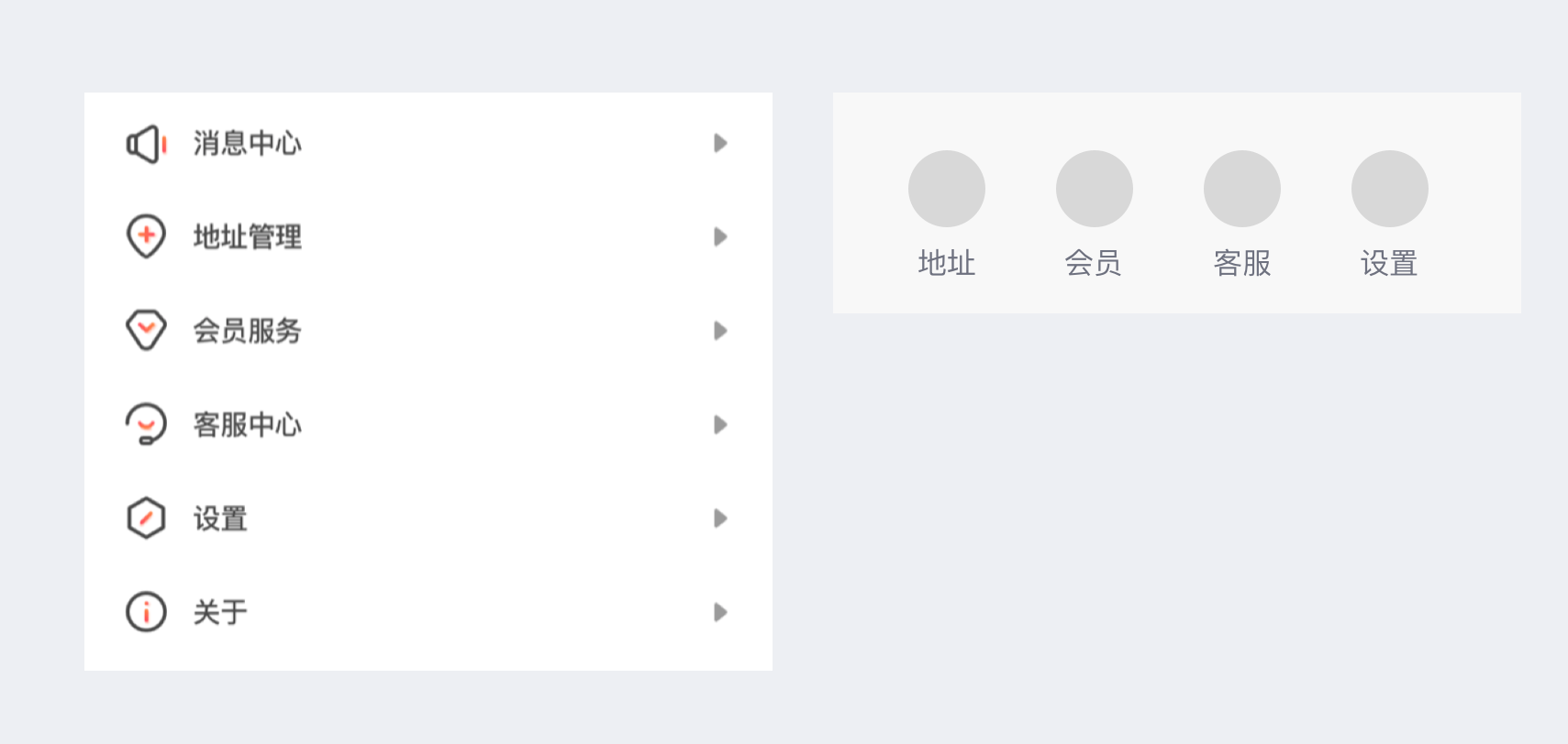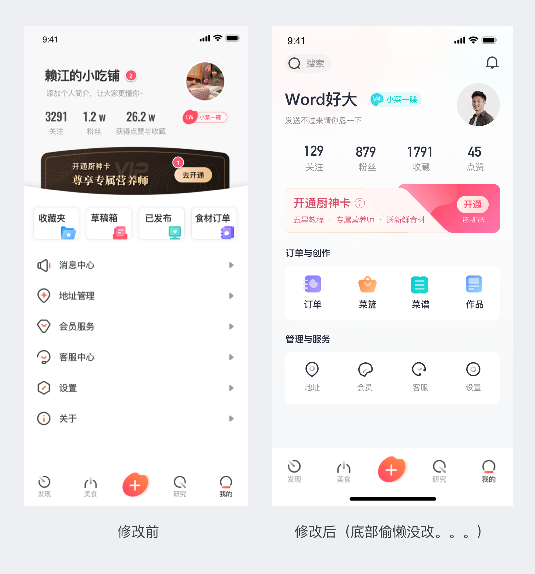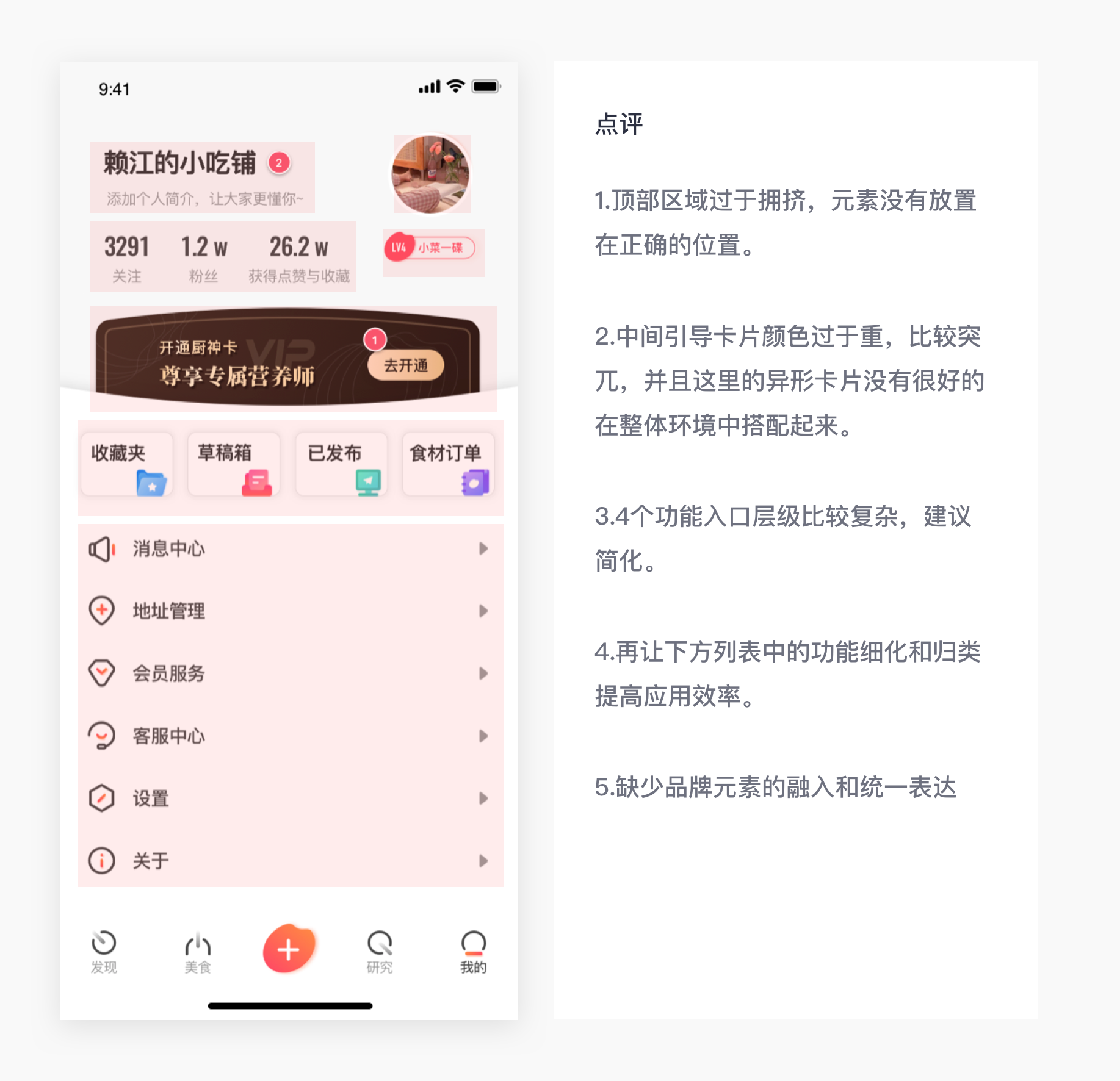 接下去,下方的功能列表在浏览上效率过低,我们看到要浏览完这列信息我们视线需要折行,并且这些功能是不需要都放在页面下方去堆叠,其实顶部导航栏也是可以利用起来的,由于这是一款美食类的产品,用户很多时候也会在个人中心去搜索我创建的食谱、作品等内容,所以像搜索和消息可以直接放在导航栏,而设置和关于这些较低频的操作就可以合并起来,那么原来6行列表就变为了4行,那这四行内容我们可以直接用横向排列的形式去做了。