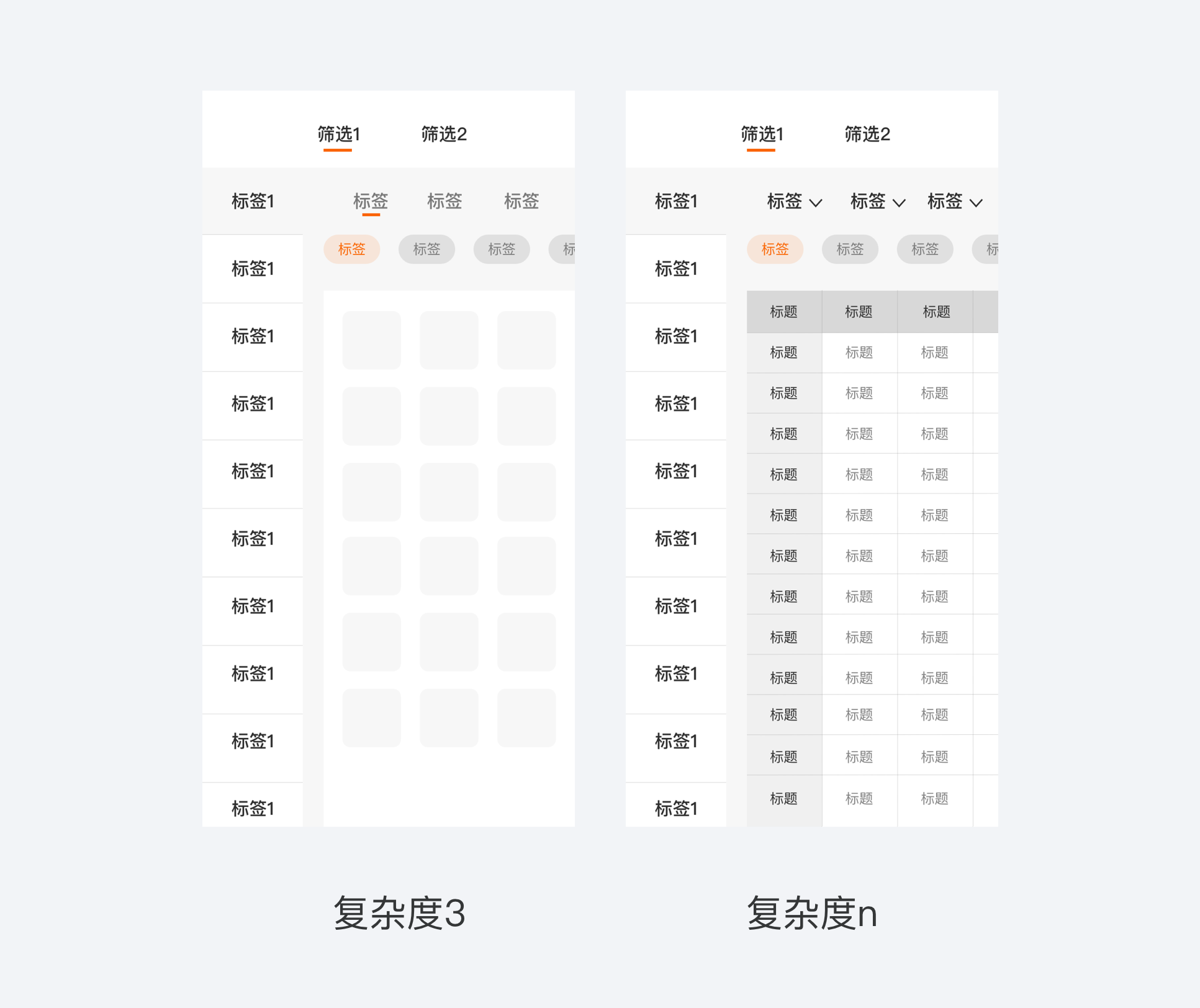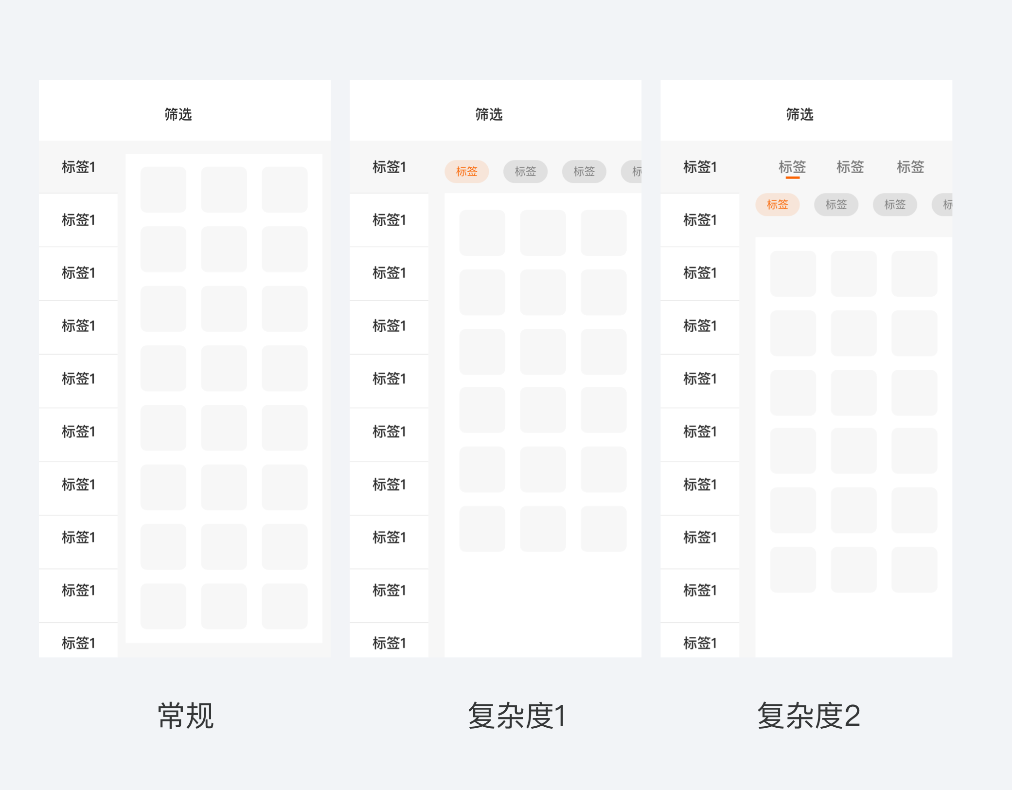 因为移动端的导航太有限了,像pc端左侧和顶部的筛选控件可以放多层联动,并且横向可以展开更多的标签,但是移动端横线太受限了,大家可以看一下如果我们真的要整体迁移的话就会变成以下这样的情况,但是移动端的核心的方便快捷,并不适合那么复杂的内容在一个界面去进行交互流转,所以左侧纵向tab导航不会出现下拉展开的二级联动。