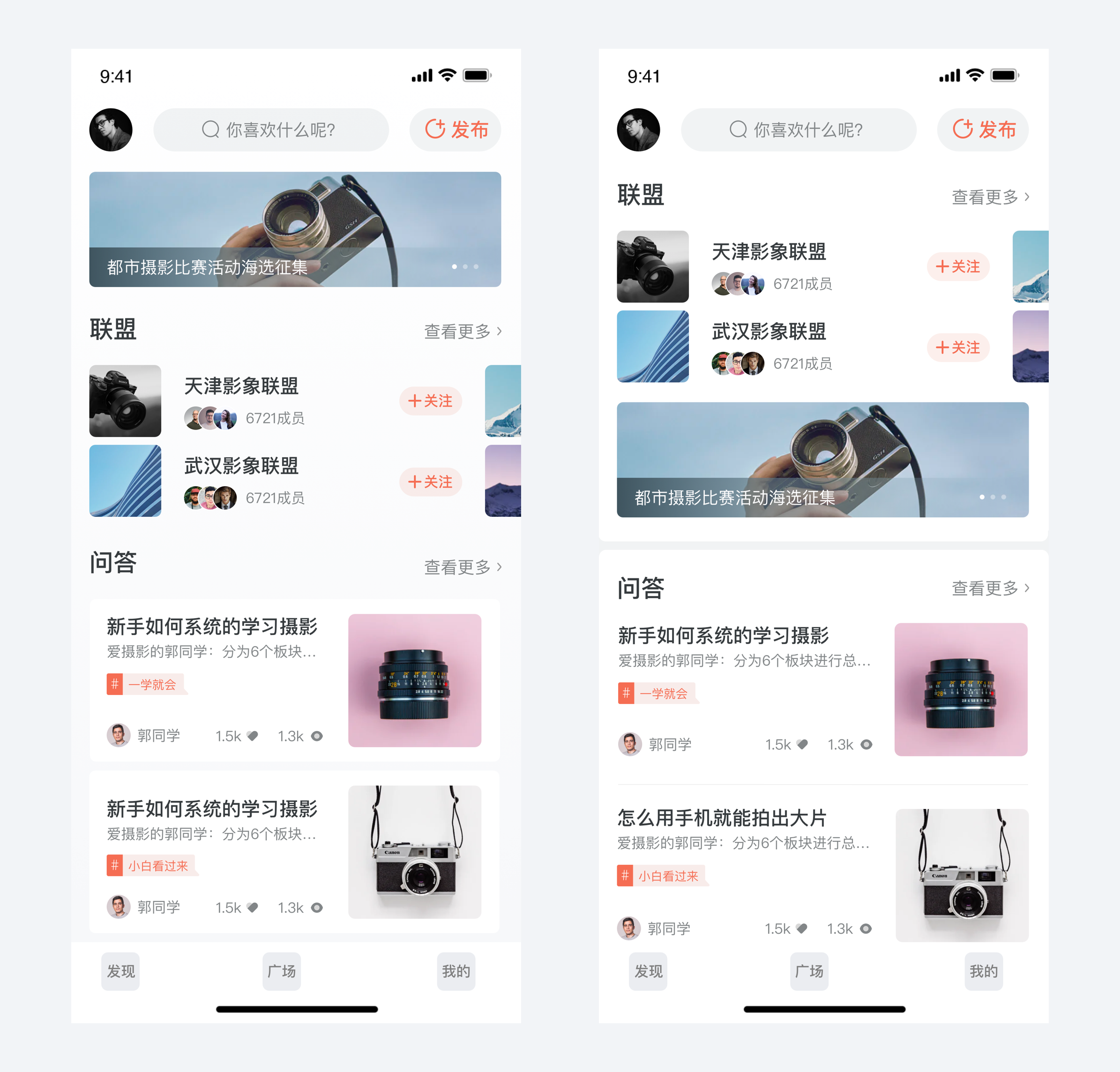然后底部的左文右图区域的信息又比较密集,和上半部分形成了一个明显的反差。另外加上一些小细节的处理不到位:卡片投影太短太深,圆角不够统一,文字行间距不合理,功能位置摆放不合理,这样整体就感觉到很多瑕疵。另外如果只是自己做练习那么图片可以选择的更美观一些,而不需要收到产品业务的限制,那么我们花10分钟来重新调整一下整体的布局和优化一些细节。