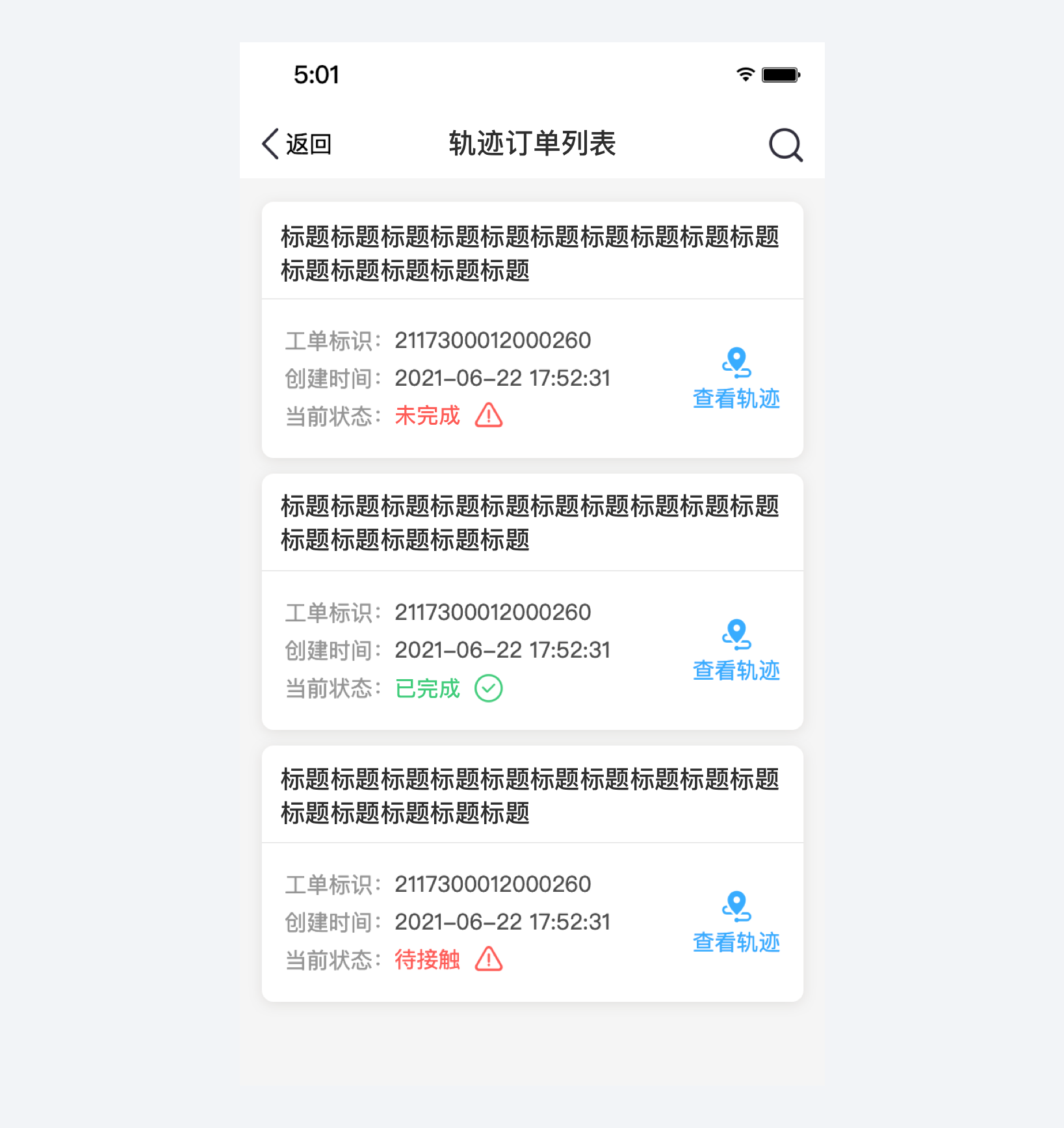 而查看轨迹按钮我还是去掉了,考虑到的既然这里是轨迹轨迹订单列表那么用户就知道进来是要查看轨迹的,所以不需要全部在卡片中给按钮,这个也是web和移动端的区别,移动端的卡片是可以整体点击的,就和电商的订单列表、提现记录等卡片列表一样的都可以点进详情,而web中的卡片则不行,所以用户在这里反正需要点击一次,那么这里就不需要给一个轨迹按钮,还显得更复杂。