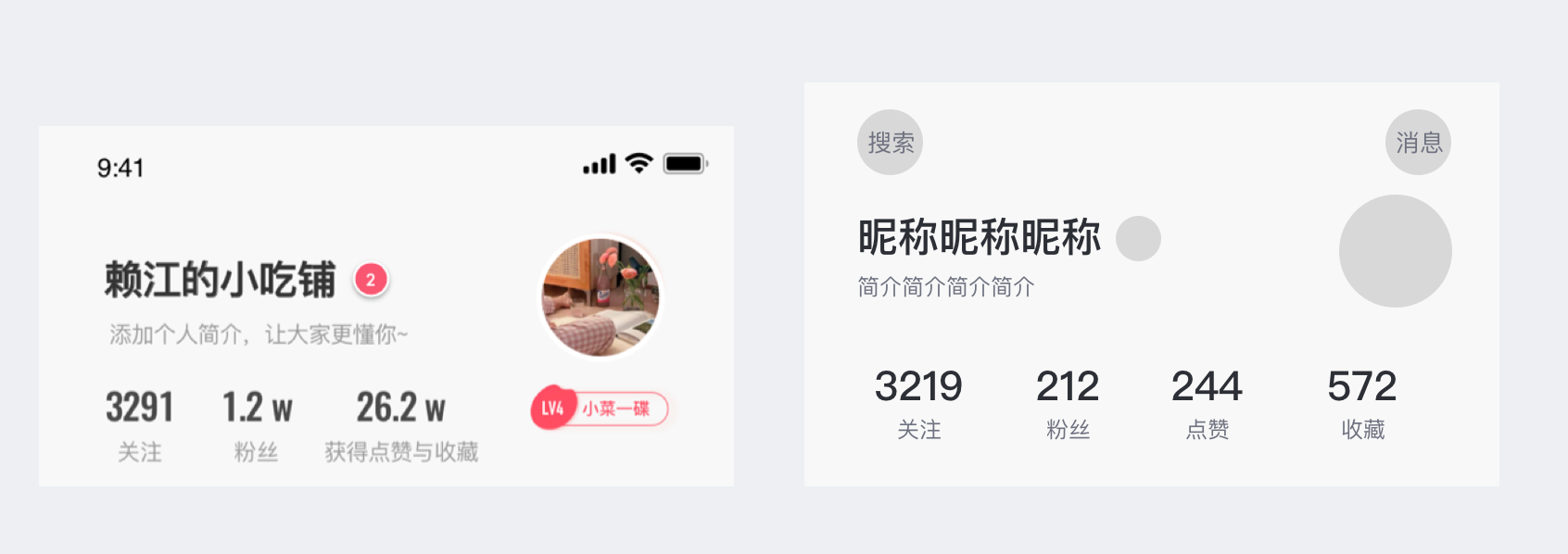另外数字的字体使用也会有一种被挤扁的感受,这里不建议用这样很瘦的字体。并且这里其实他将点赞和收藏一起收了起来可能是因为左侧放不下了,那么我们直接就另一起一行放数字新信息即可。这样名字与头像和平衡对称,数字又可以水平平均铺开,这是一种常规的处理方法。