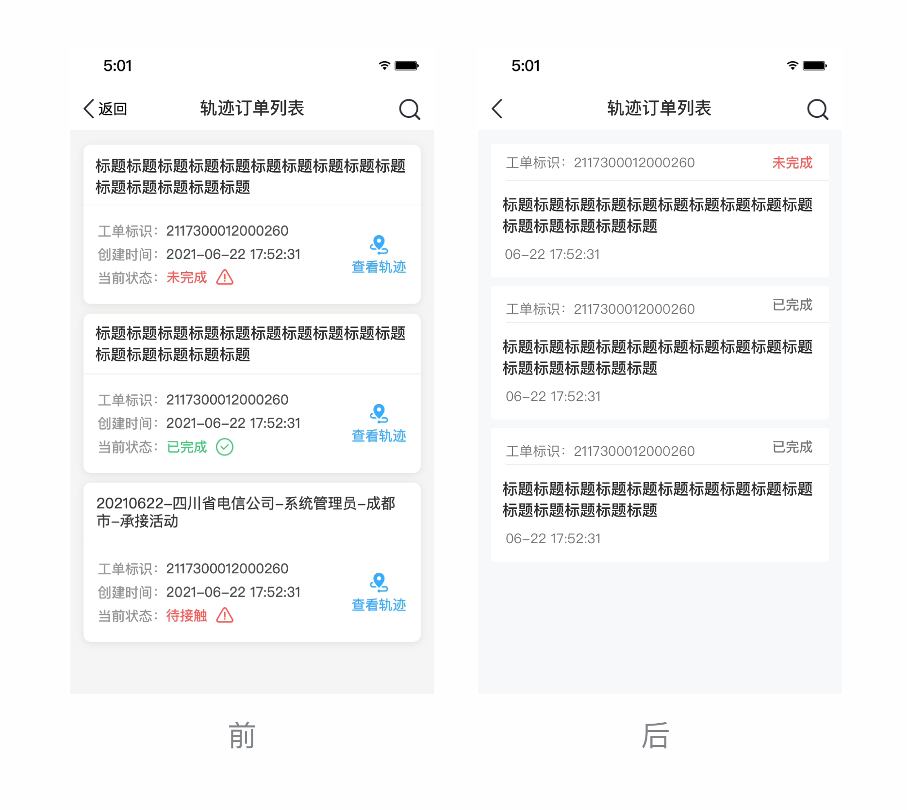 这个列表的信息很有pc端的特点,这位同学其实是有意识的将重要信息强化了,但是pc端到移动端我们是可以简化很多信息和细节的,另外在用户浏览的路径上也会有不同,那我们看到这个卡片中的信息,从上往下依次浏览好像并没有问题,但就是因为没有问题,这才是问题,类似这样的信息卡片,其实如果按照这样排,那么用户就会浏览完所有信息再做决策,而我们知道的是并不是所有信息都需要让用户去关注到,例如最终要的是标题、状态和查看轨迹,而不重要的是工单和创建时间,怎么判断重不重要呢?一个是用户查看和操作的频率,另外就是业务侧的侧重点。这边为了隐藏一些敏感信息某些文案就处理了一下,大家可以看一下我们方案的前后对比。