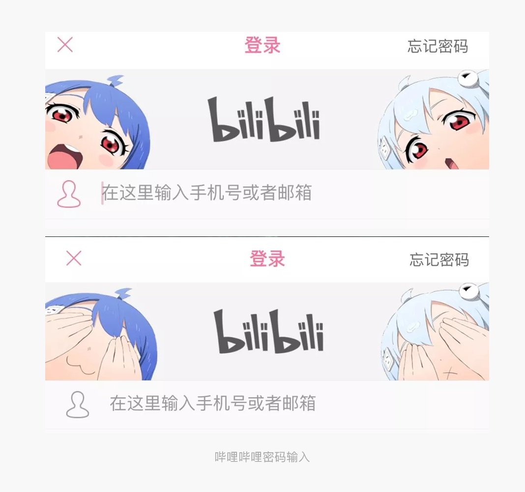 哔哩哔哩在输入账号密码这个操作时,背景中的动漫人物会捂住双眼,整个密码输入的流程操作和其他产品并无太多的差异,但是因为这个捂眼睛的细节变化,会给用户强大的心理暗示,让用户为自己的隐私受到保护和尊重而产生安全感和对产品的信赖,拉升提高了对产品的好感度。