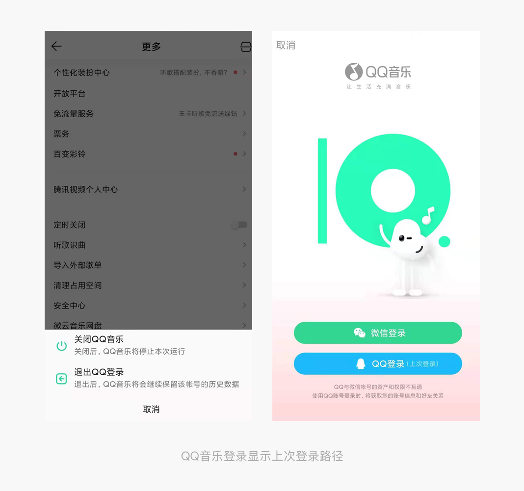 在我们退出重新登录时,往往因为记不住上一次登录方式,而反复尝试第三方登录方式去登录自己之前的账号,一种不行再退出再登录下一种,满心欢喜的登录进去发现不是自己想要登录账号,体验感真的很差,QQ音乐会在用户重新登录时,提示(上次登录)方式,引导用户快速,高效的选择自己的登录路径,减轻用户的记忆负担。