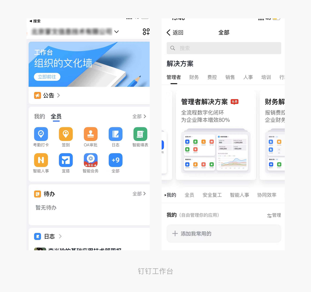 钉钉作为面对B端企业使用,需要针对不同部门不同的职位设计不用功能入口,产品功能非常复杂臃肿,因为职业性质不同所用的功能操作的频率也不同,工作台界面用户可以去自定义常用功能,点击添加将工作中经常使用的一些功能添加进入,自定义自己的工作台,很大的给用户自主性,方便用户的操作使用,增加对产品的友好度。