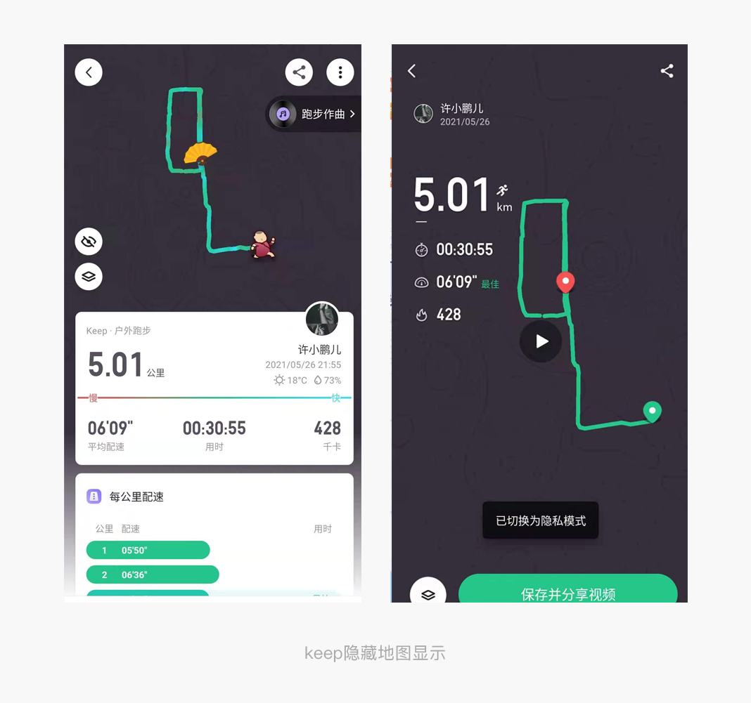 不记录下来怎么发朋友圈,不发怎么让自己的男神or女神看到自己在努力,当然也是为了得到正反馈,晒的行为本身,就是一种正能量!是在传递跑步带给人们的快乐,愉快和满足感。一旦晒出来不管是什么的社交平台,至少会有人看到,有人评论/点赞。算是对着的奖赏,keep应用每次在跑完以后会自动生成跑步轨迹地图。跑步是一个长期的运动,大多数的跑步路线是固定的且在居住周围运动,keep考虑到对于隐私和安全的方面在轨迹生成地图上会做出隐藏地图操作,只是单纯的显示跑步路线保护了用户的隐私,提升了安全保障。